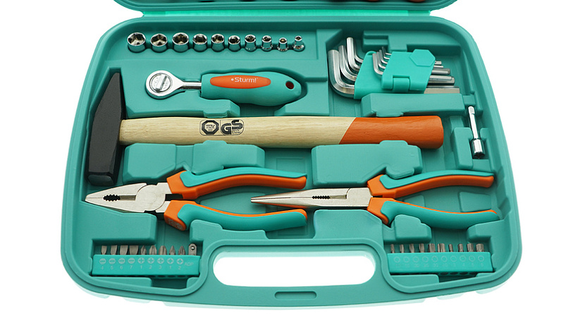 Набор инструмента из 57 предметов для мелкого бытового ремонта и обслуживания транспортных средств. Удобный и прочный пластиковый кейс обеспечивает надежное хранение инструмента.