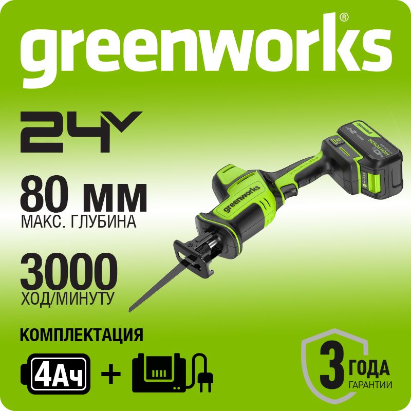Пила сабельная акк. Greenworks GPT-CRS-25, 24V, б/щет, 0-3000/мин, рез 80 мм дер., LED, 1х4Ач,ЗУ,кор (1200507CUB)