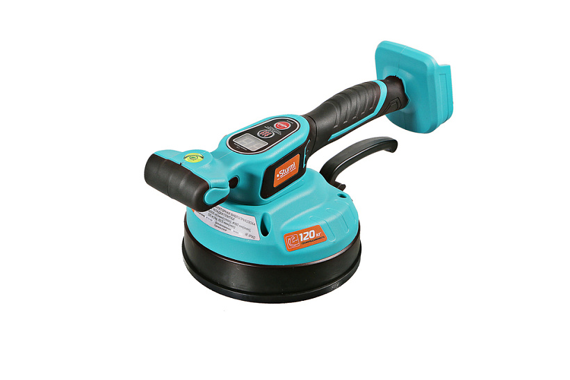 Аккумуляторная виброприсоска для укладки плитки Sturm! TV18120 — профессиональный инструмент, разработанный для переноса, подъема, выравнивания при укладке напольной и настенной плитки больших размеров и веса, керамогранита, гранитных и мраморных плит. Грузоподъемность — 120 кг. Диаметр подошвы — 160 мм.