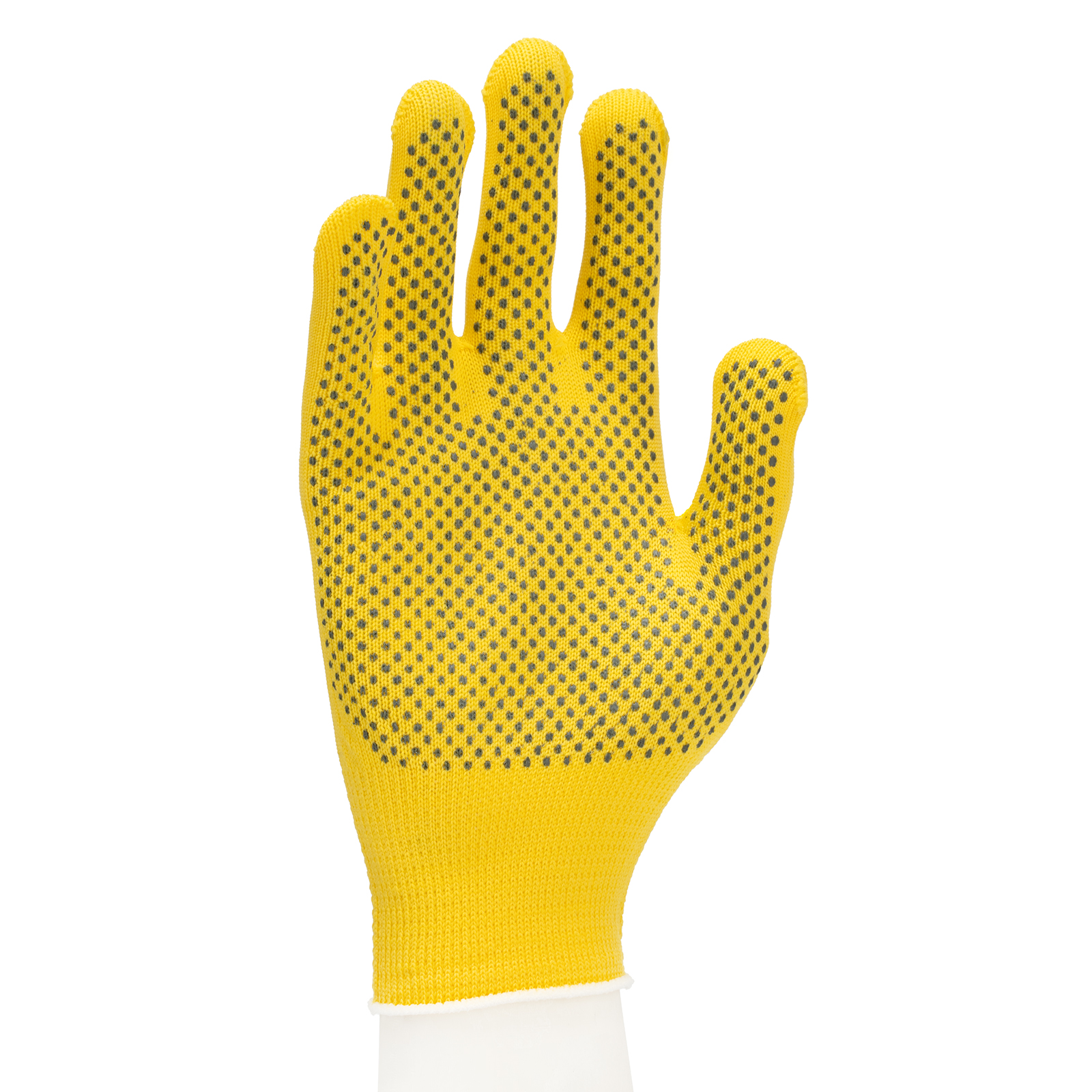 Перчатки из синтетической нити 67827 с ПВХ точкой, цвета «лимон», 13 класс вязки, размера L, применяются для защиты рук от царапин и ссадин. Они станут незаменимым помощником при осуществлении строительных, ремонтных, садовых и других работ. Плотная ткань из тонких синтетических нитей сохраняет высокую чувствительность пальцев, что особенно актуально при проведении точных работ.