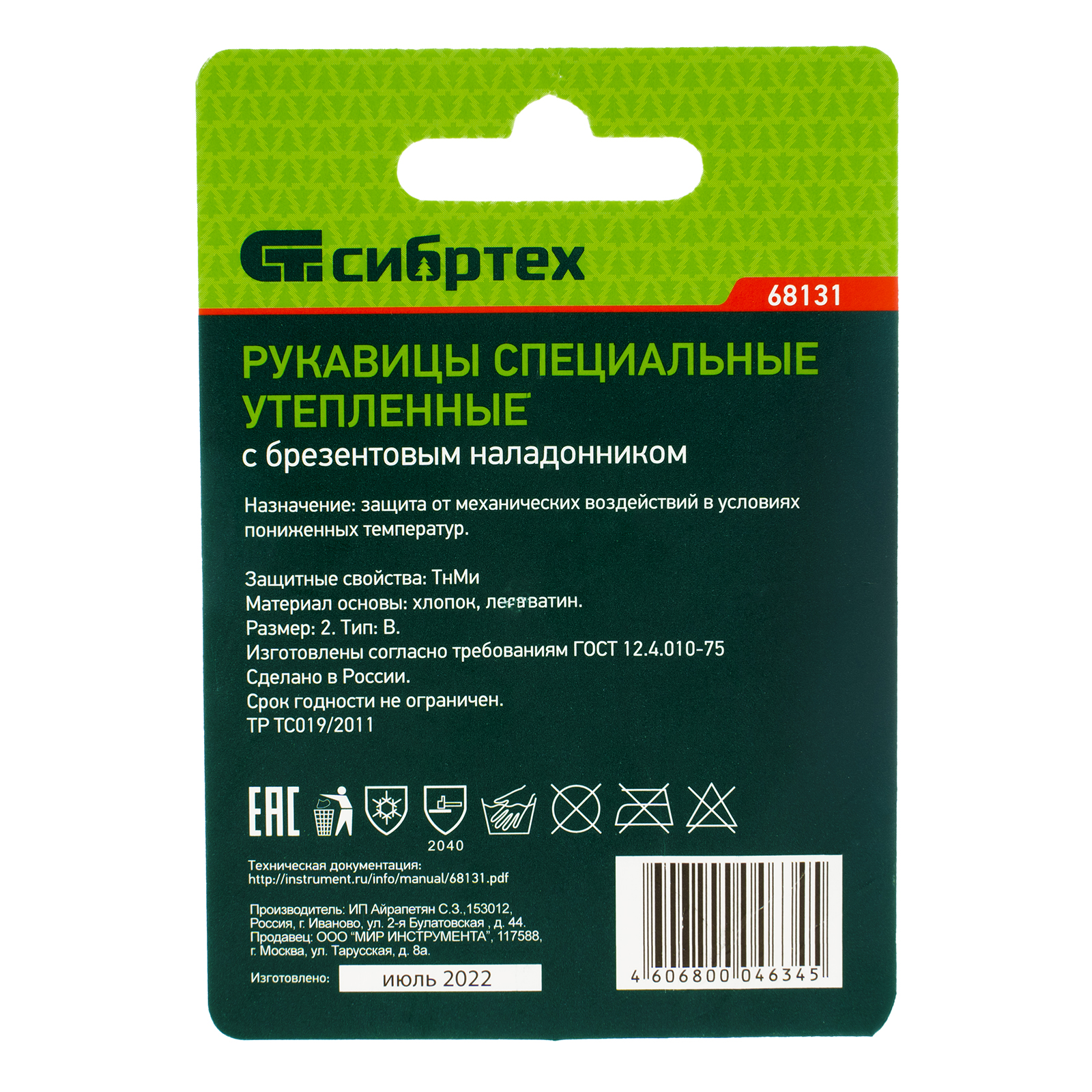 Специальные х/б рукавицы Сибртех 68131 2 размера, из двунитки, утепленные ватином, с наладонником, — средство защиты рук от механических воздействий во время строительных, ремонтных, сельскохозяйственных и других работ. Относятся к категории зимней спецодежды, поэтому их можно использовать в условиях пониженных температур.