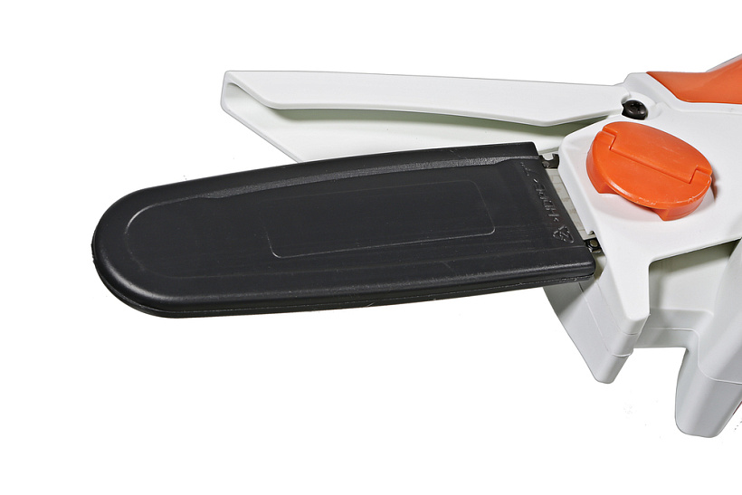 Откидной защитный кожух делает работу с пилой безопасной. При необходимости задействовать всю длину шины, кожух откидывается под углом 90°.