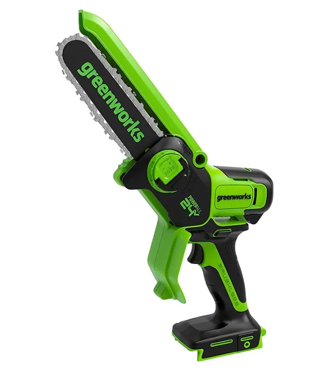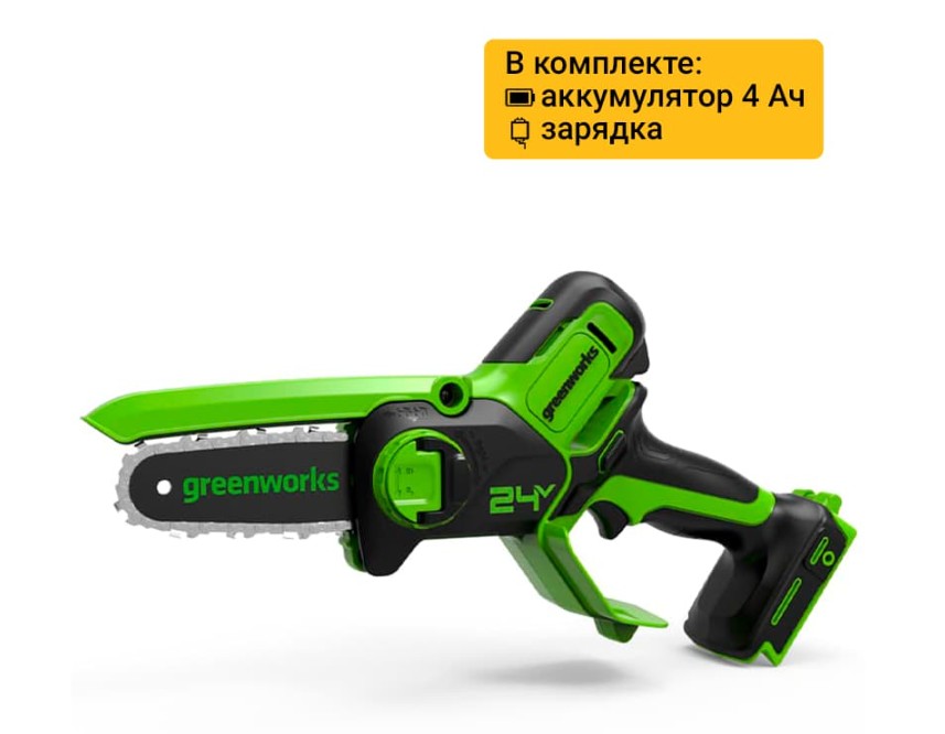 Цепная мини-пила Greenworks GD24CSMNX 24V — компактная цепная пила из серии 24V предназначена для распила сучьев и кустарников. Оснащена шиной 15 см, скоростью цепи 7,8 м/c, бесщеточным двигателем. Смазка цепи вручную.