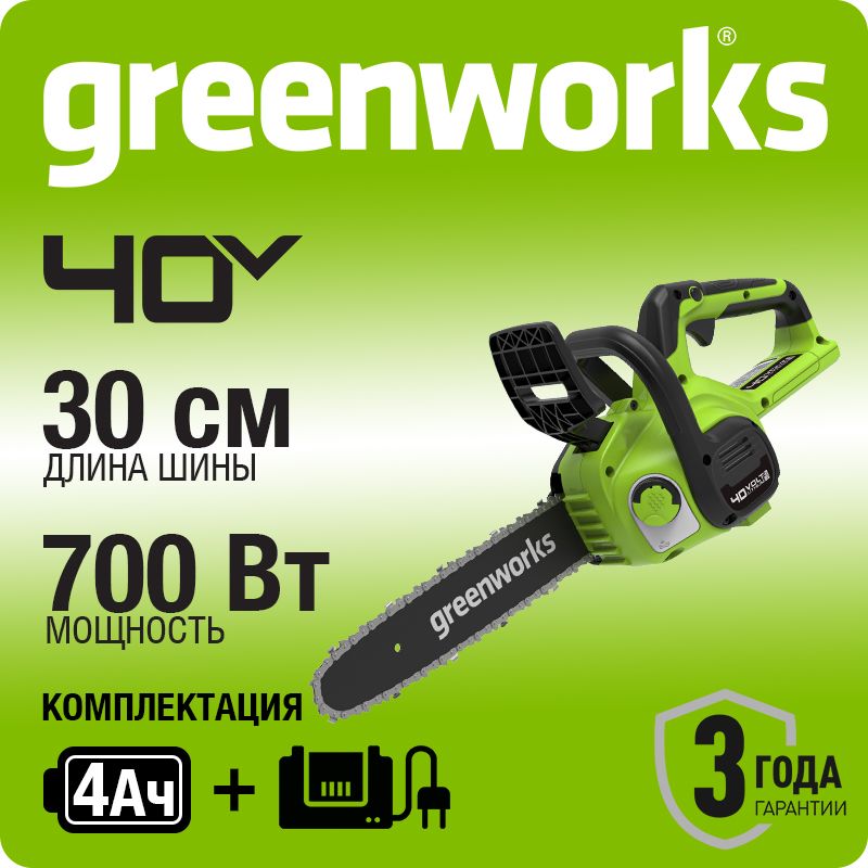 Цепная пила аккумуляторная Greenworks Арт. 2007807UB, 40V, 30 см, с 1xАКБ 4Ач и ЗУ - небольшая, легкая (всего 2,7 кг) садовая пила.
