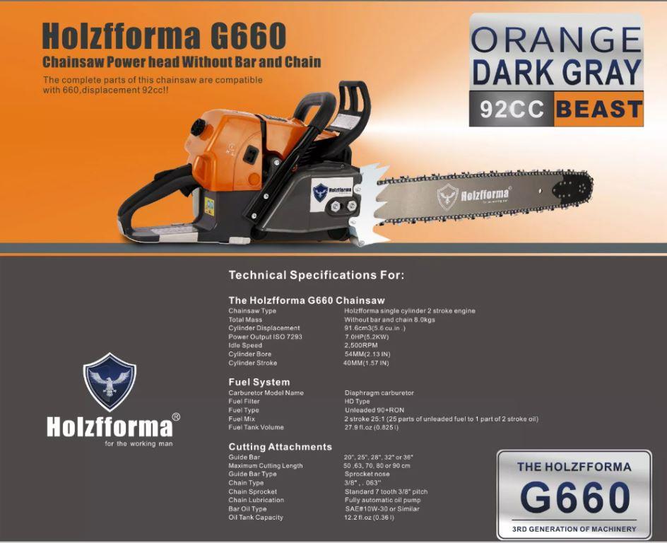 Бензопила Holzfforma G660 - профессиональная бензопила, которая специально разработана для тяжелой работы с большим лесом, где предусмотрены экстремальные нагрузки. Инструмент прекрасно справляется с валкой деревьев, средний диаметр которых 60 см, обрезкой сучьев, заготовкой крупномерной древесины, а так же раскряжевкой. Устройство обладает высокой мощностью и производительностью.