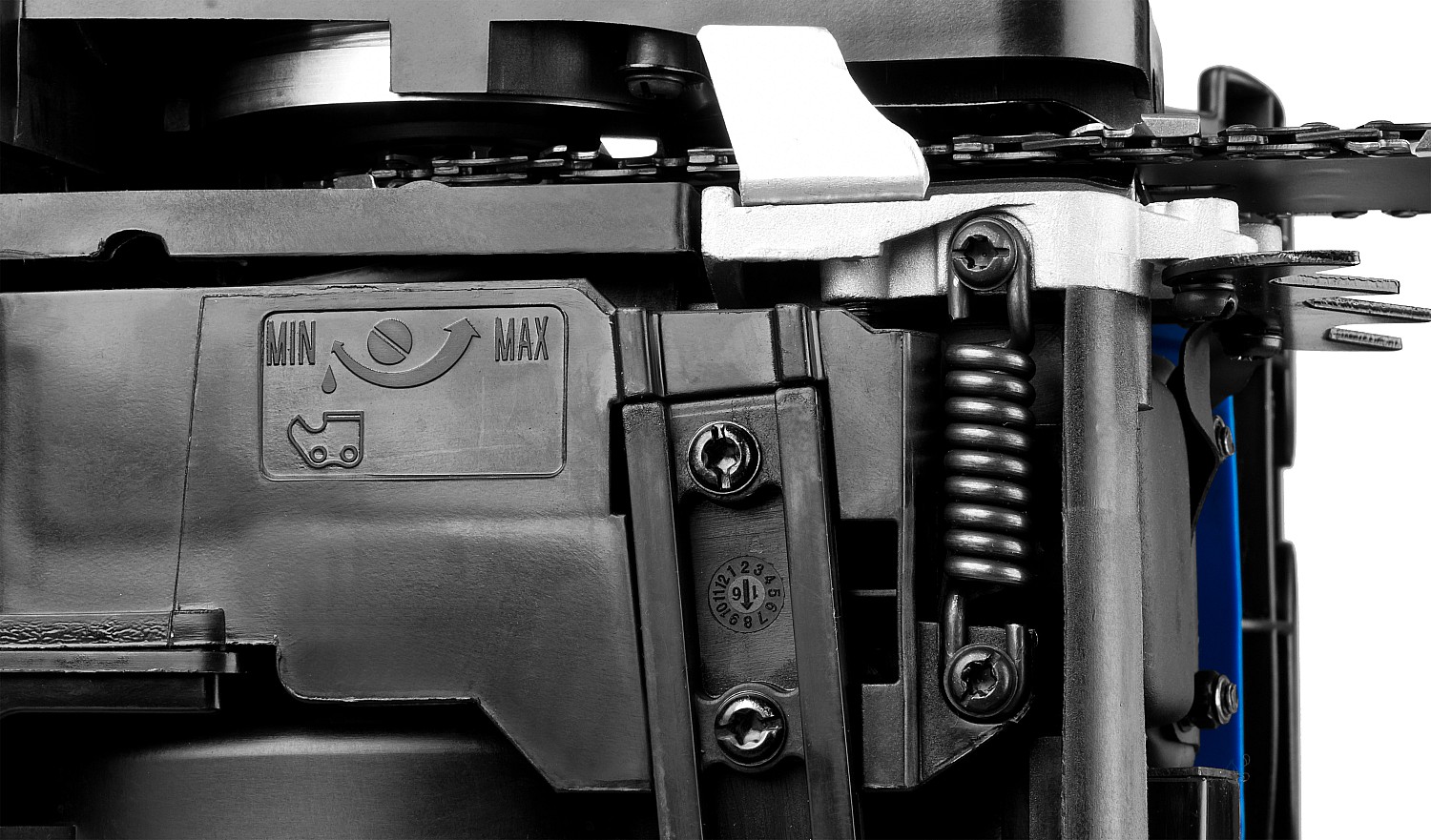 - Автоматическая система смазки цепи дозированно подает масло, в зависимости от нагрузки и отключает подачу масло на холостых оборотах