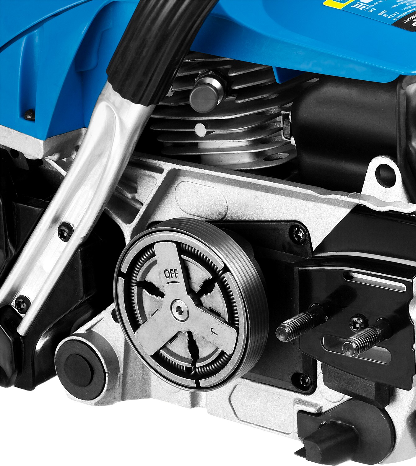 Идеальный вариант для пиления досок, бруса, стволов различных пород дерева на дачном участке. В отличие от электрической, бензиновая пила оснащена более мощным двигателем, безопасна в отношении поражения электрическим током, может работать в любую погоду и в любом месте. Функции легкого запуска, автоматической смазки цепи и эффективная антивибрационная защита делают пилу легкой в обращении и комфортной в работе. Двойной тормоз цепи, приводимый в действие при откидывании защитного щитка или при отпускании клавиши блокировки на рукоятке, а также встроенный цепеуловитель и металлический упор делают пилу безопасной в применении. Большая удельная мощность, высокое качество применяемых материалов и изготовления, обеспечивающие увеличенный ресурс, делают бензиновую пилу ЗУБР Вашим лучшим помощником