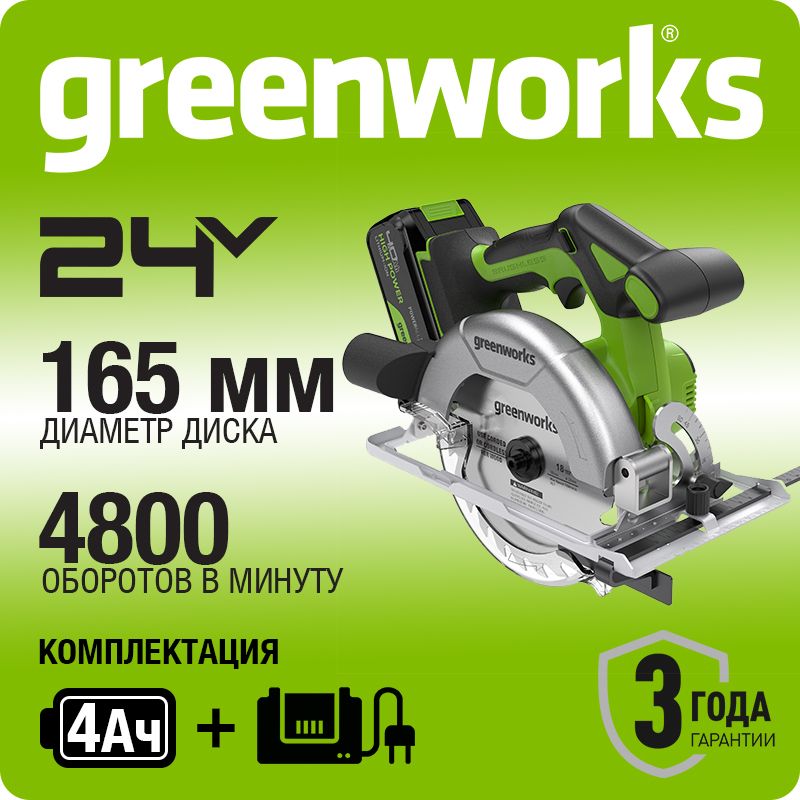 - Дисковая пила Greenworks GD24CS165 – это компактный и мощный инструмент для быстрого реза листовых и прочих древесных материалов на строительном объекте или в мастерской.