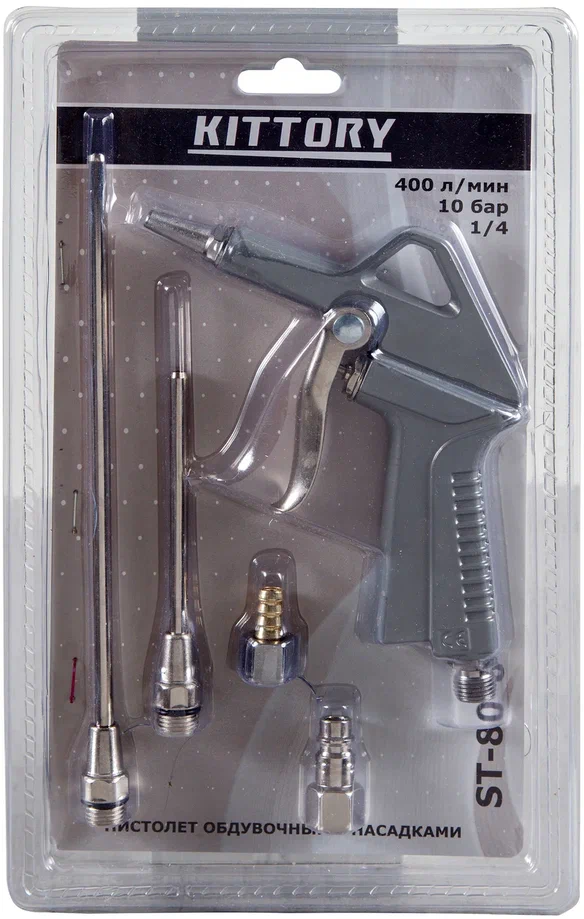 Продувочный пистолет KITTORY ST-80-6 предназначен для воздушной продувки и очистки различных поверхностей с набором сопел различной длины.