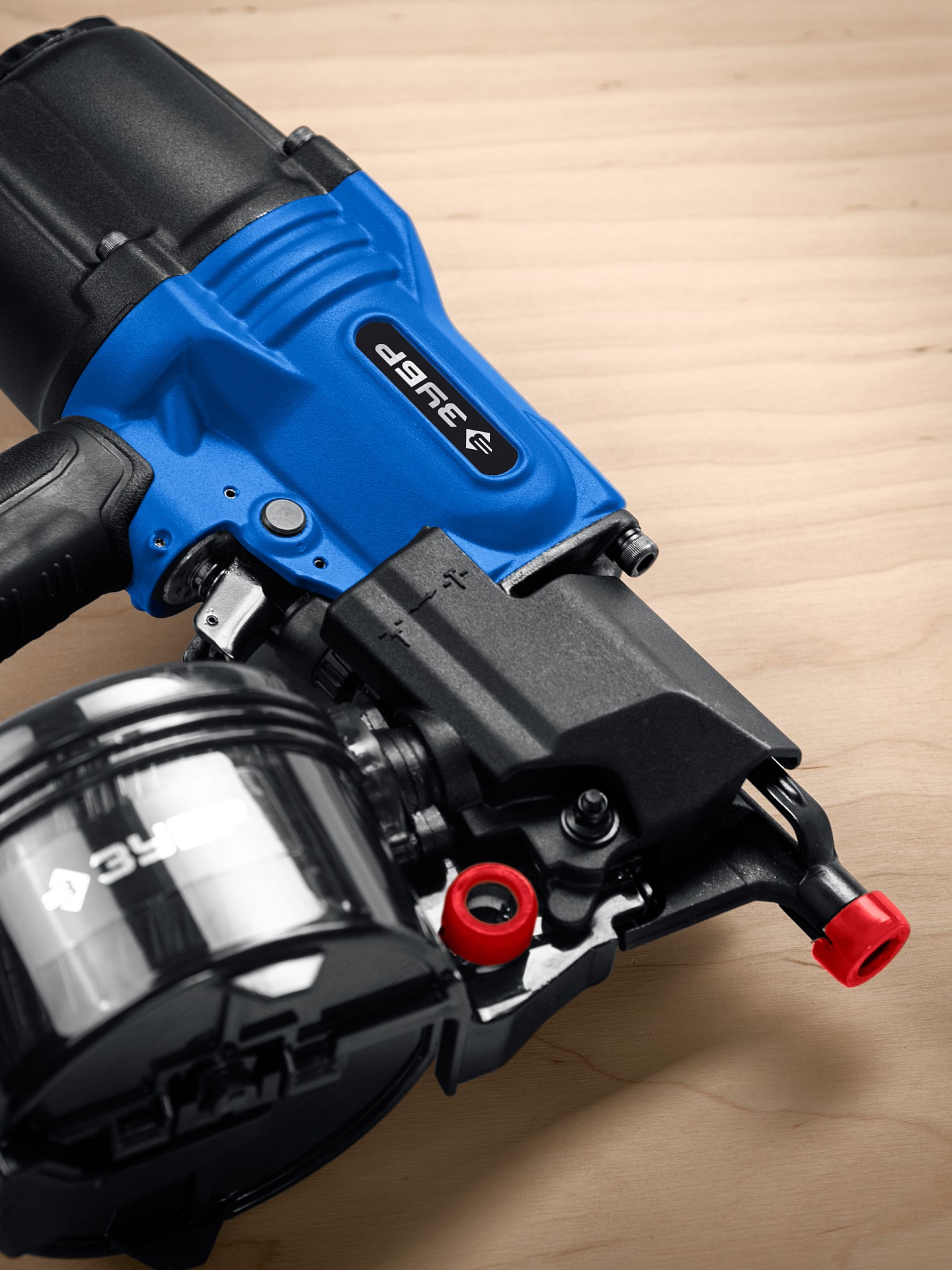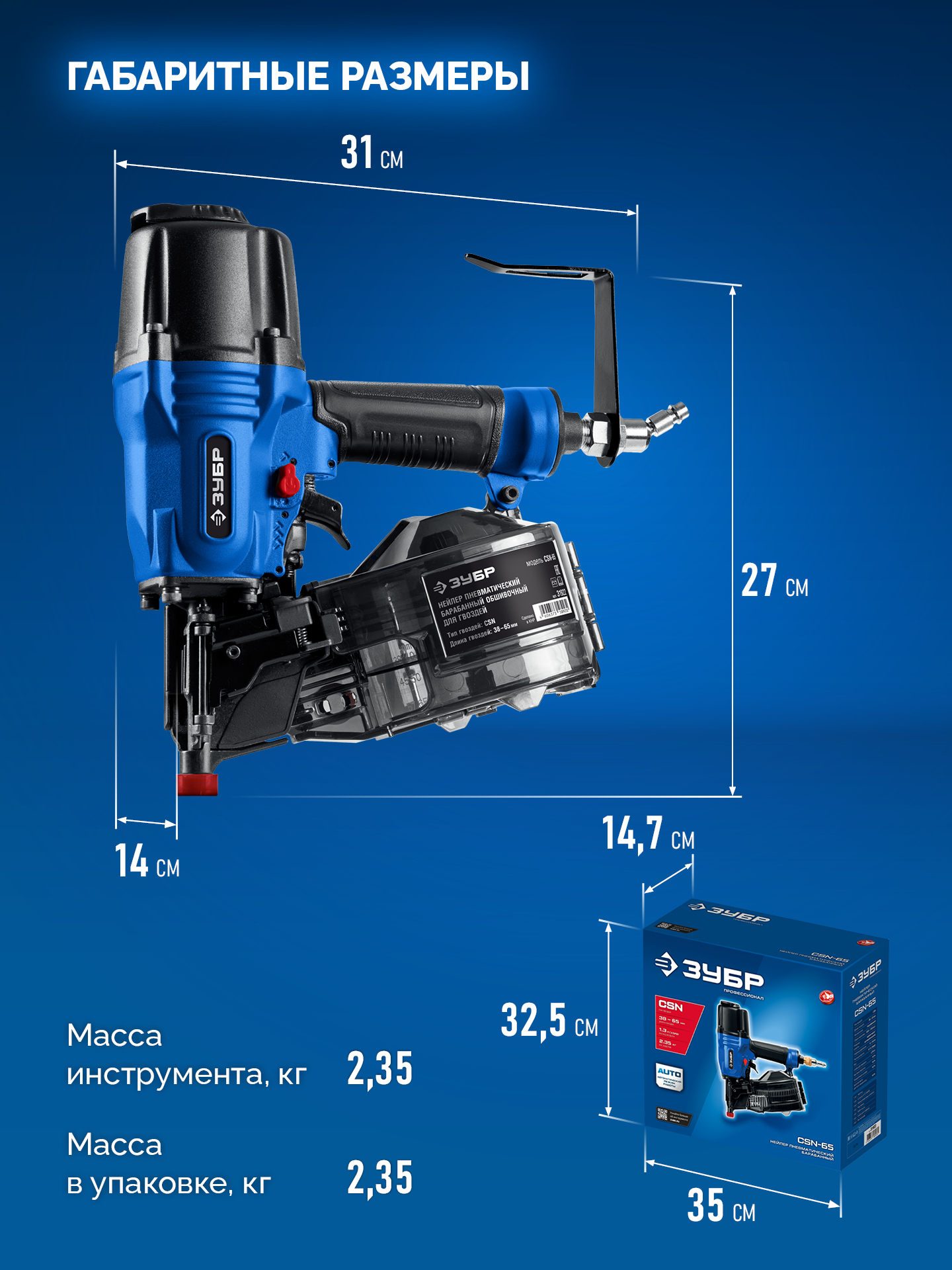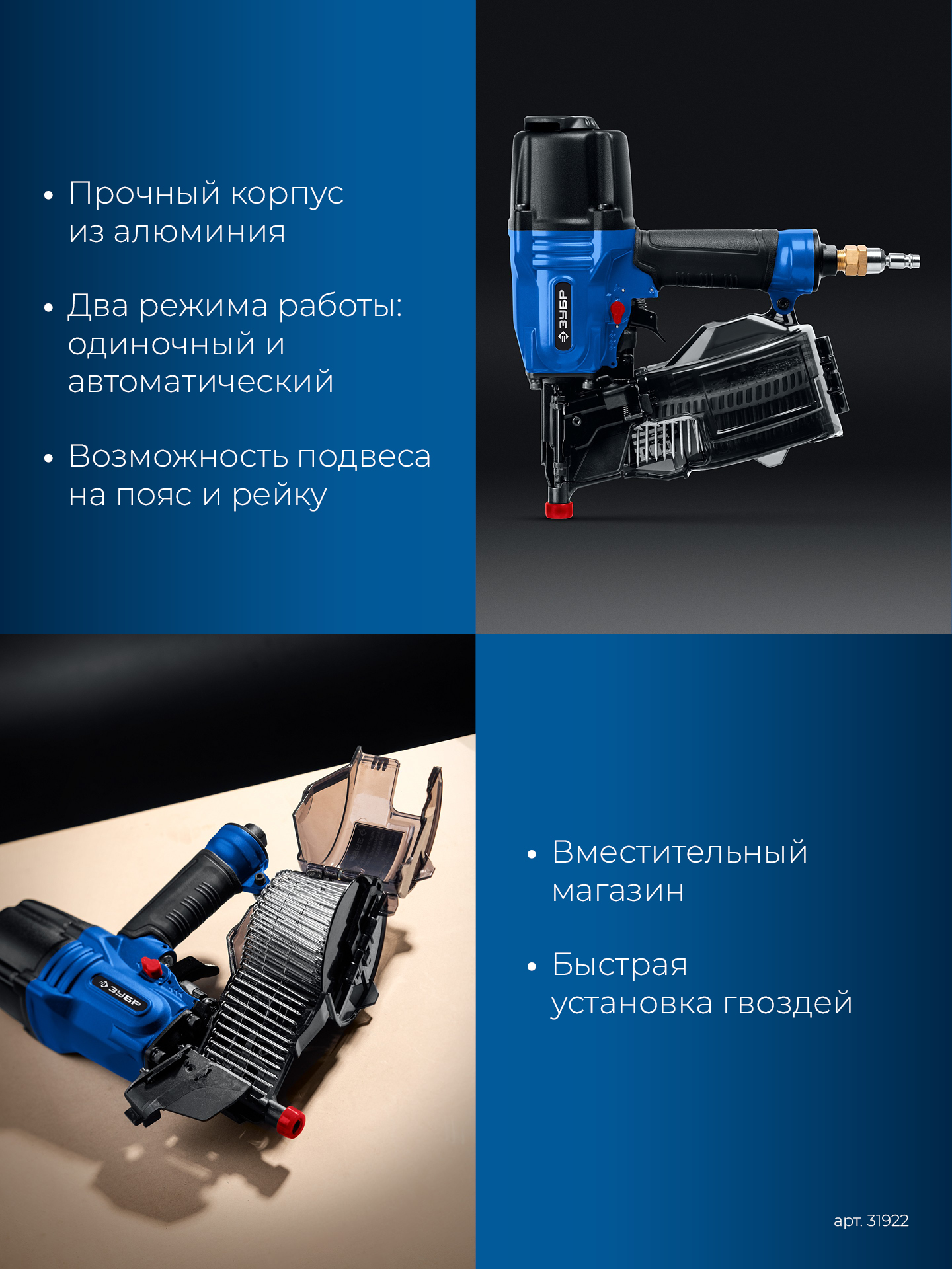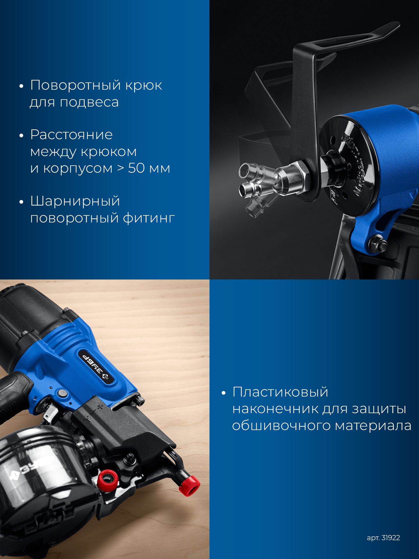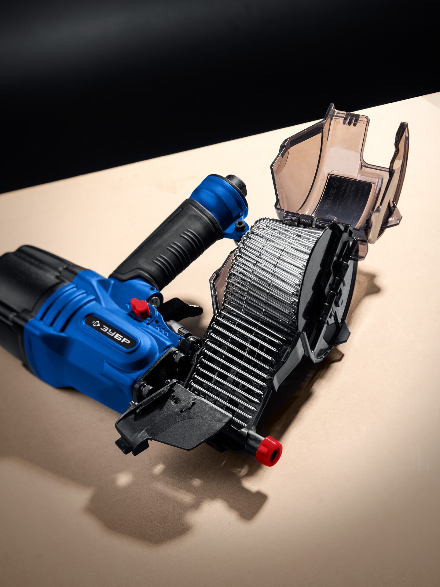 Нейлер пневматический отделочный предназначен для отделочных работ с гвоздями барабанного типа длинной 22-45 мм.Работает как с обычными гвоздями так и с оцинкованными на пластиковой ленте.