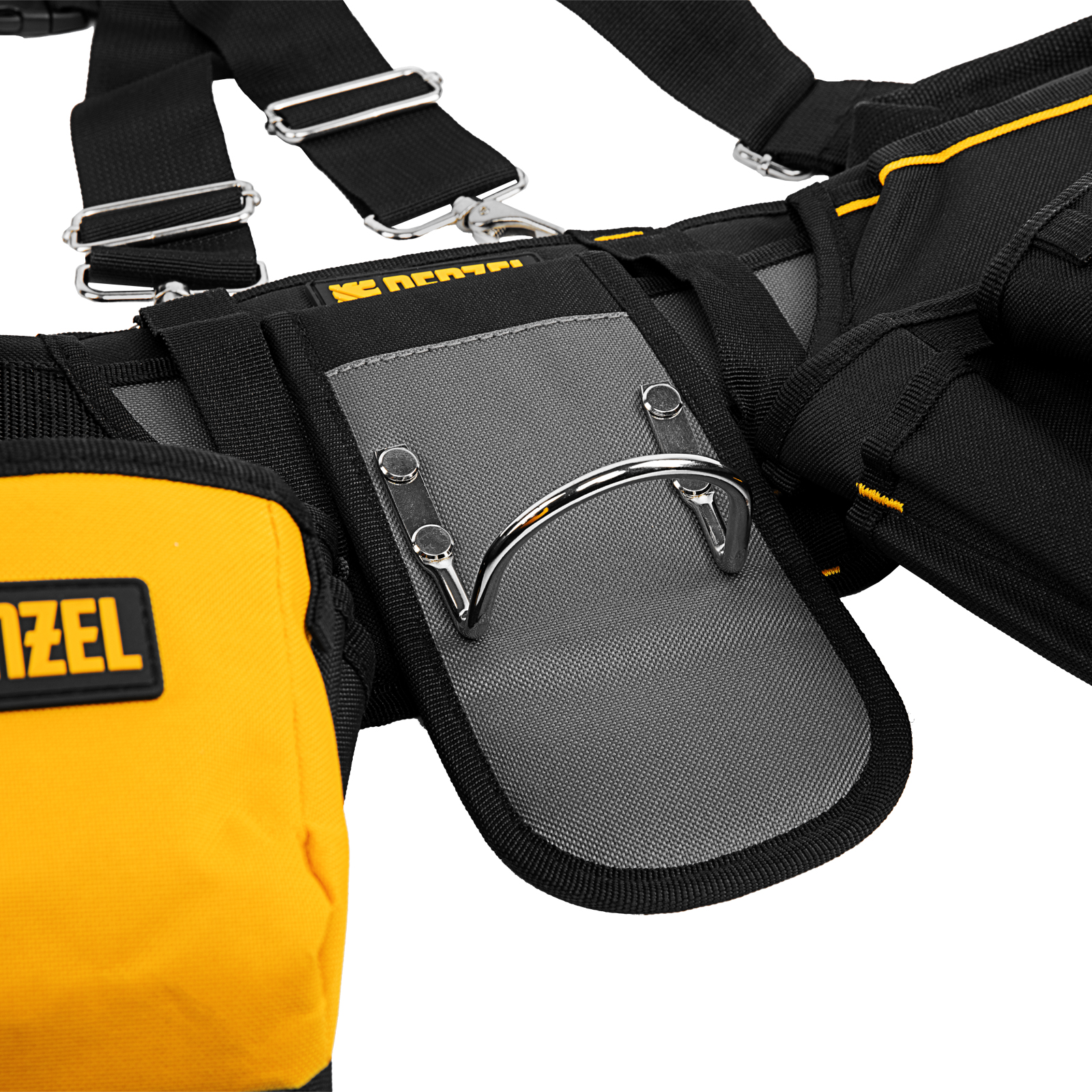 - Держатель для молотка — металлическая скоба надежно зафиксирована на поясной накладке при помощи стальных заклепок.