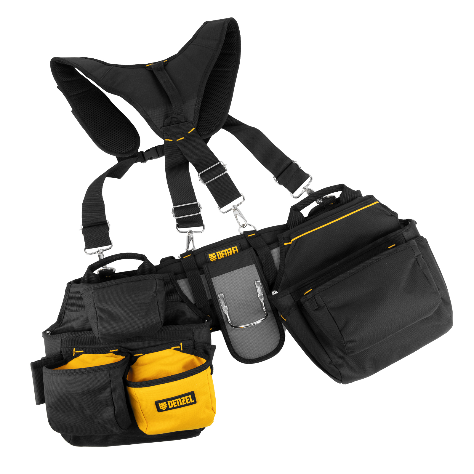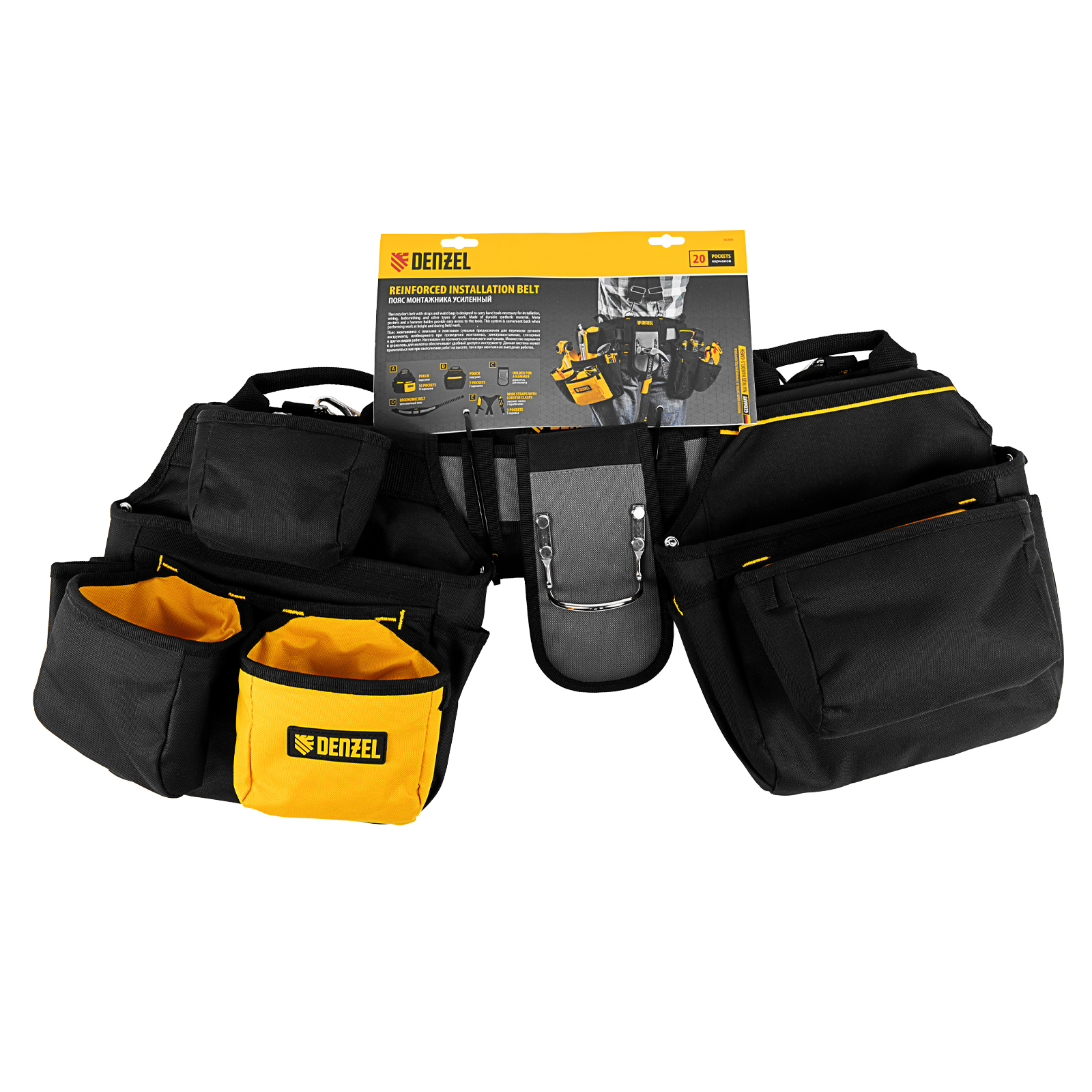 Усиленный пояс монтажника Denzel 90290 с лямками, поясными сумками и держателем для молотка оптимален для работы на высоте или на выезде. Обеспечивает быстрый доступ к нужным инструментам, оставляя руки свободными. Незаменим для выполнения монтажных, слесарных, электромонтажных и других работ.