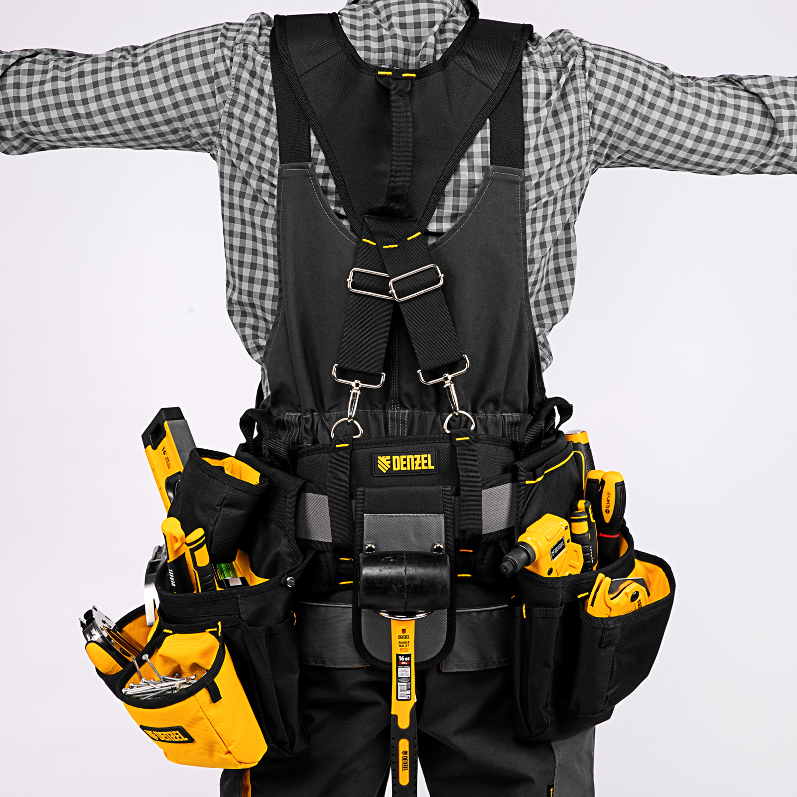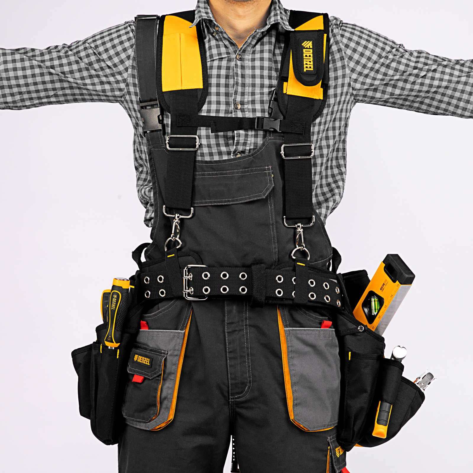 - Эргономичность — регулируемые широкие лямки равномерно распределяют вес инструментов, уменьшая нагрузку на спину.