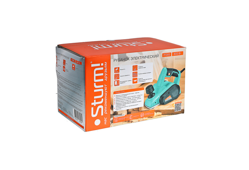 Рубанок P1085 Sturm! служит для обработки древесины любых пород. Подходит для строгания заготовок шириной до 82 мм. Функционал рубанка предусматривает возмоность выборки четверти в диапазоне до 10мм, а направляющий паз на подошве позволит снимать фаску. Выдвижной предохранительный подпятник обеспечивает защиту от повреждения обрабатываемой поверхности во время перерывов в работе. Сравнительно небольшой вес инструмента (2,46кг) и наличие 4м кабеля питания PVC гарантирует пользователю мобильность при работе.