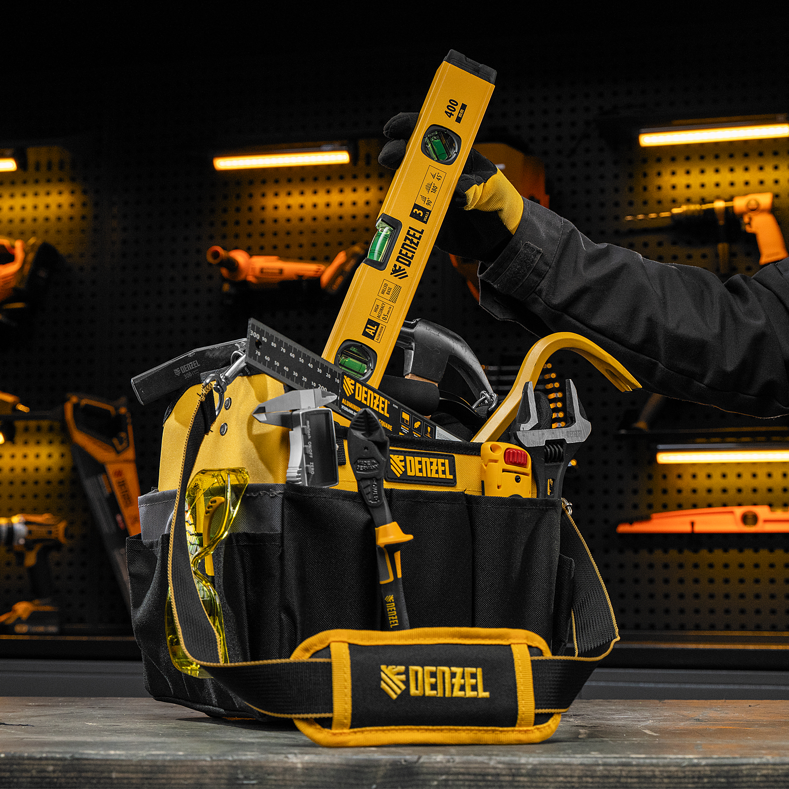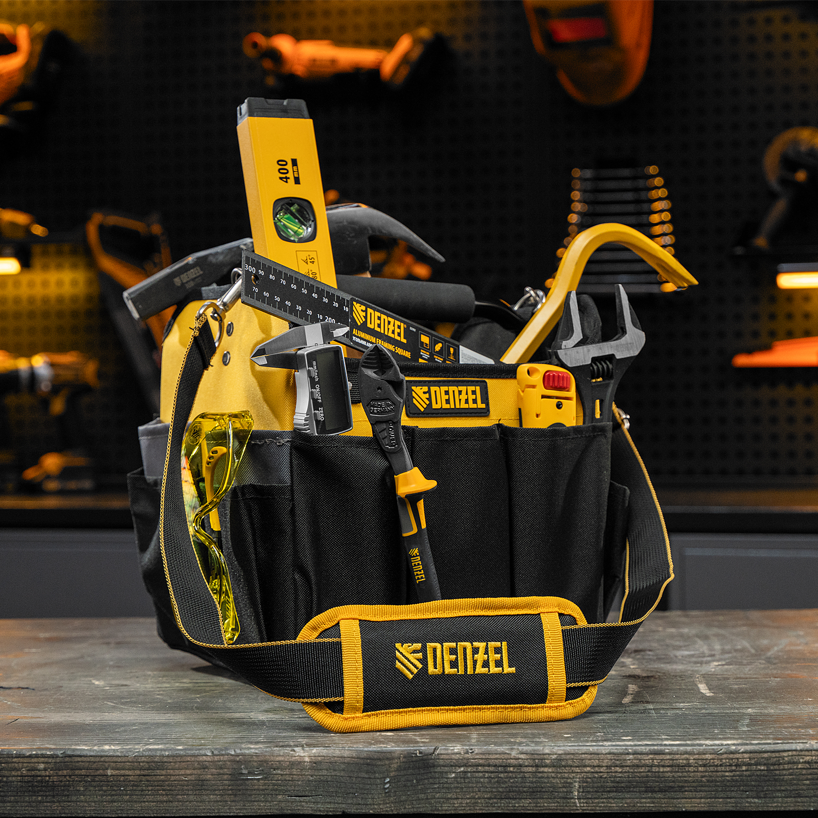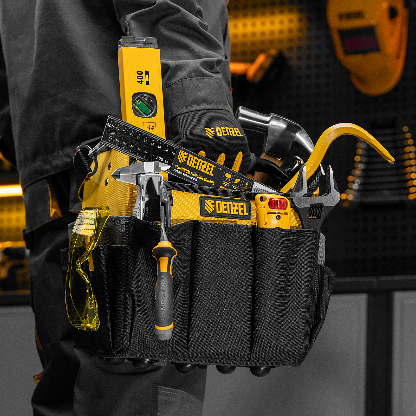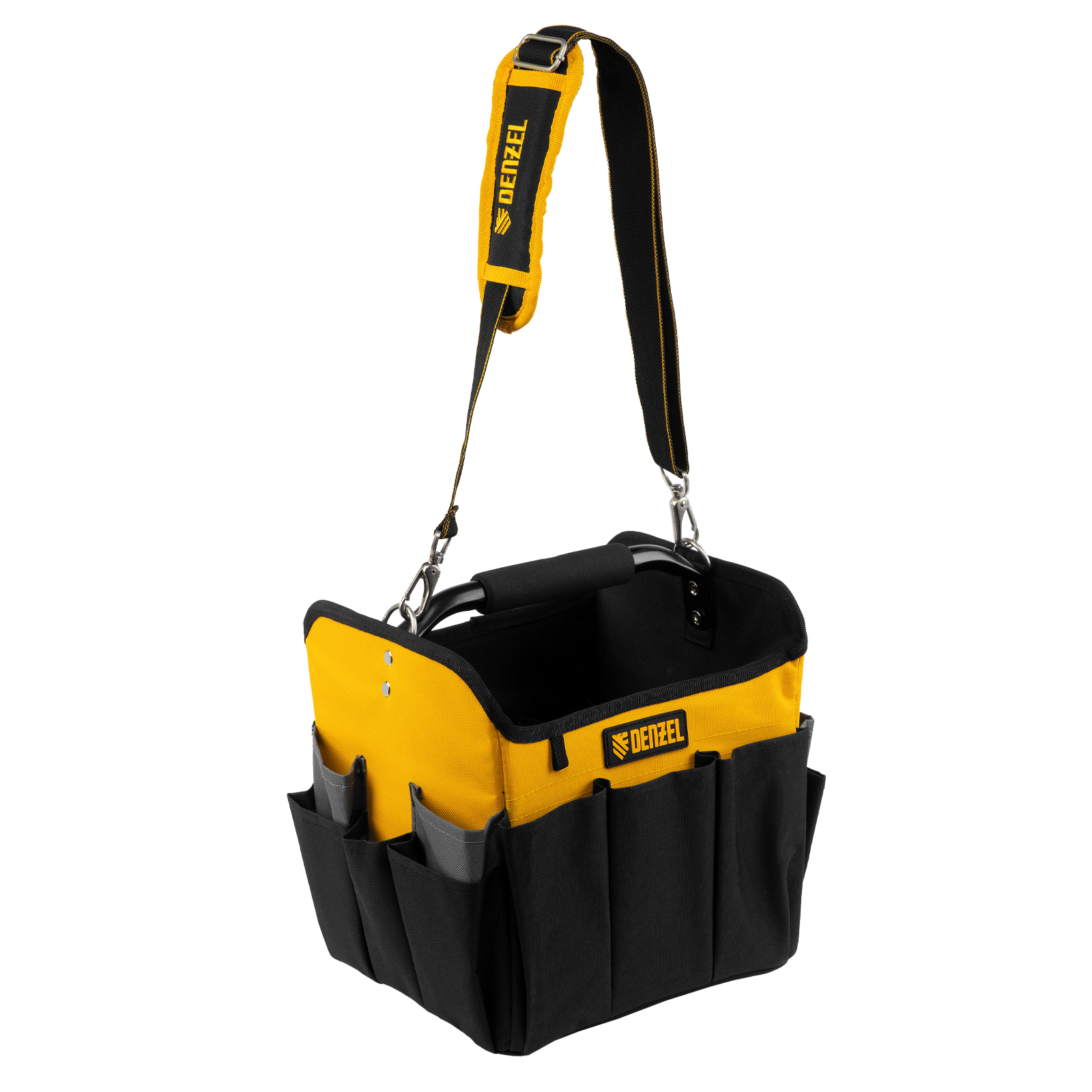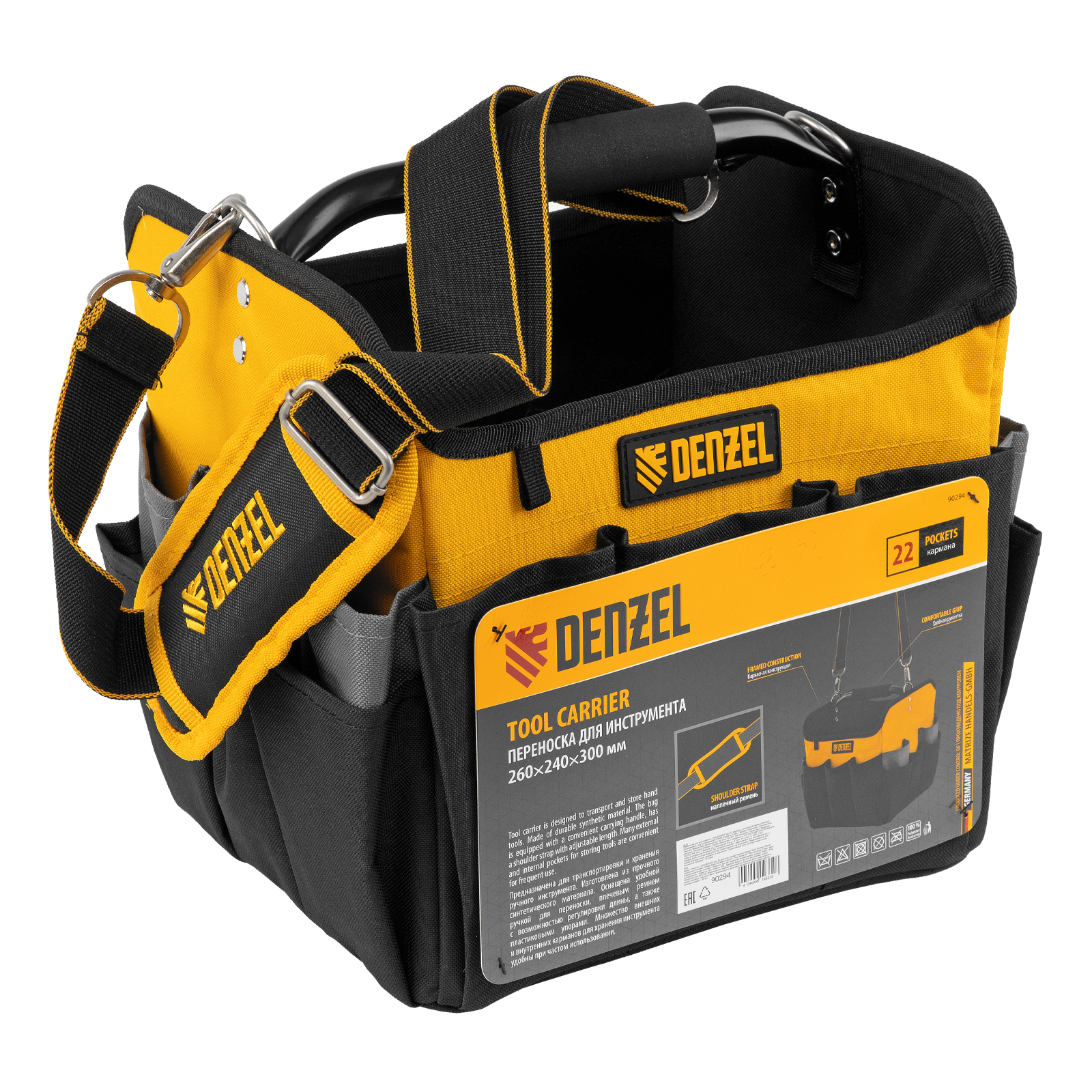 Переноска Denzel 90294 габаритами 260 х 240 х 300 мм, с наплечным ремнем, имеет вместительное основное отделение и 22 кармана. В ней можно разместить ручной и электроинструмент для хранения и транспортировки. Переноска пригодится в дороге, дома или в гараже.