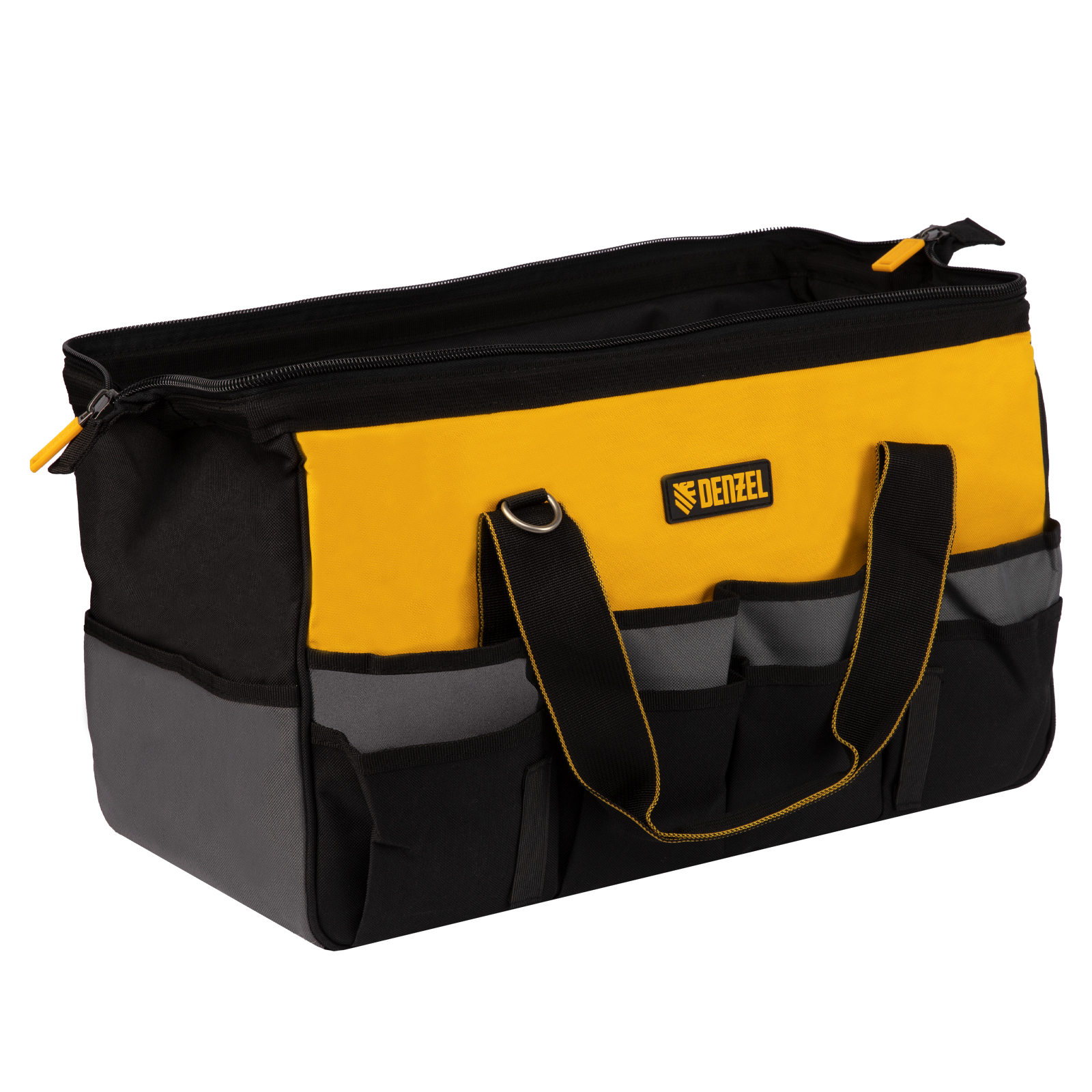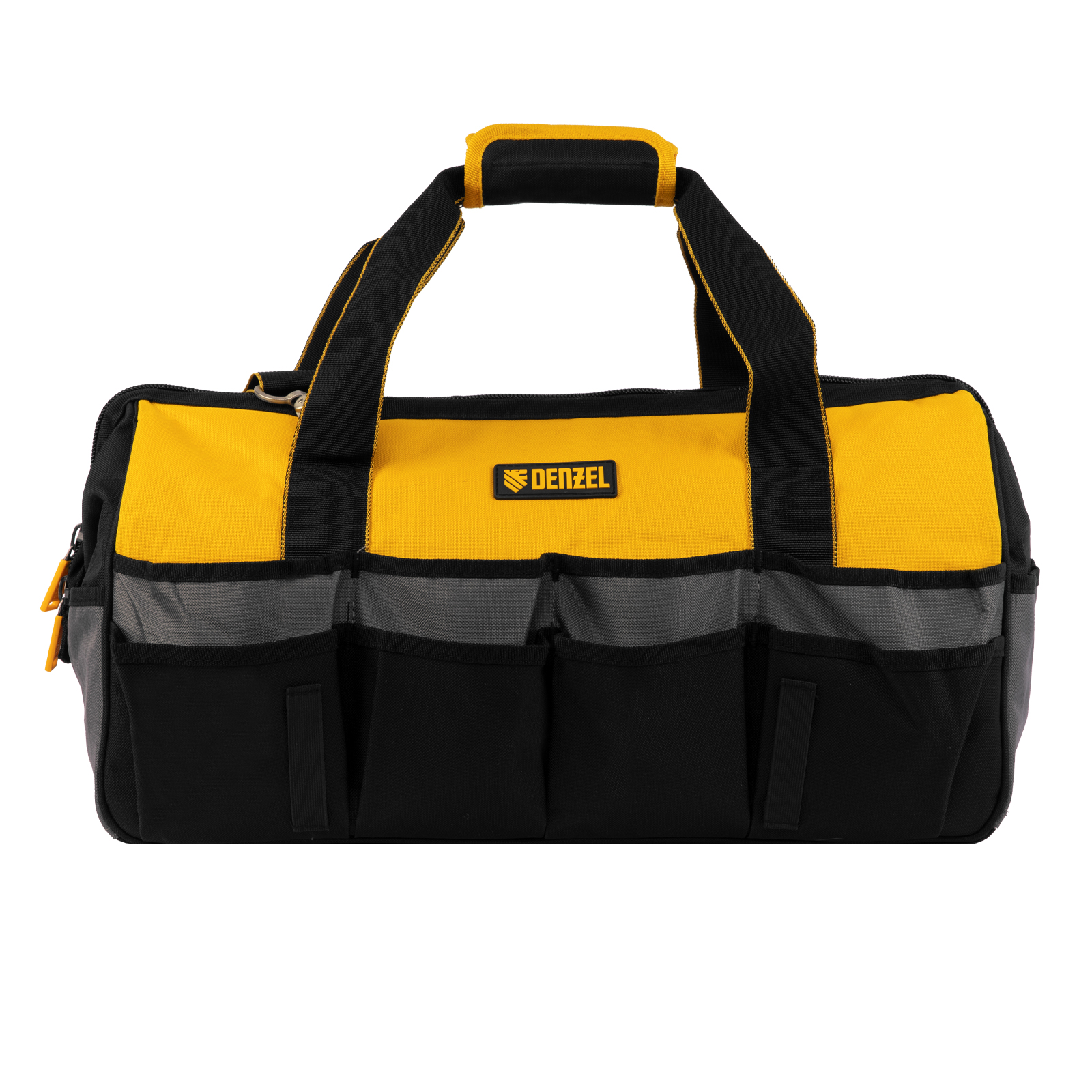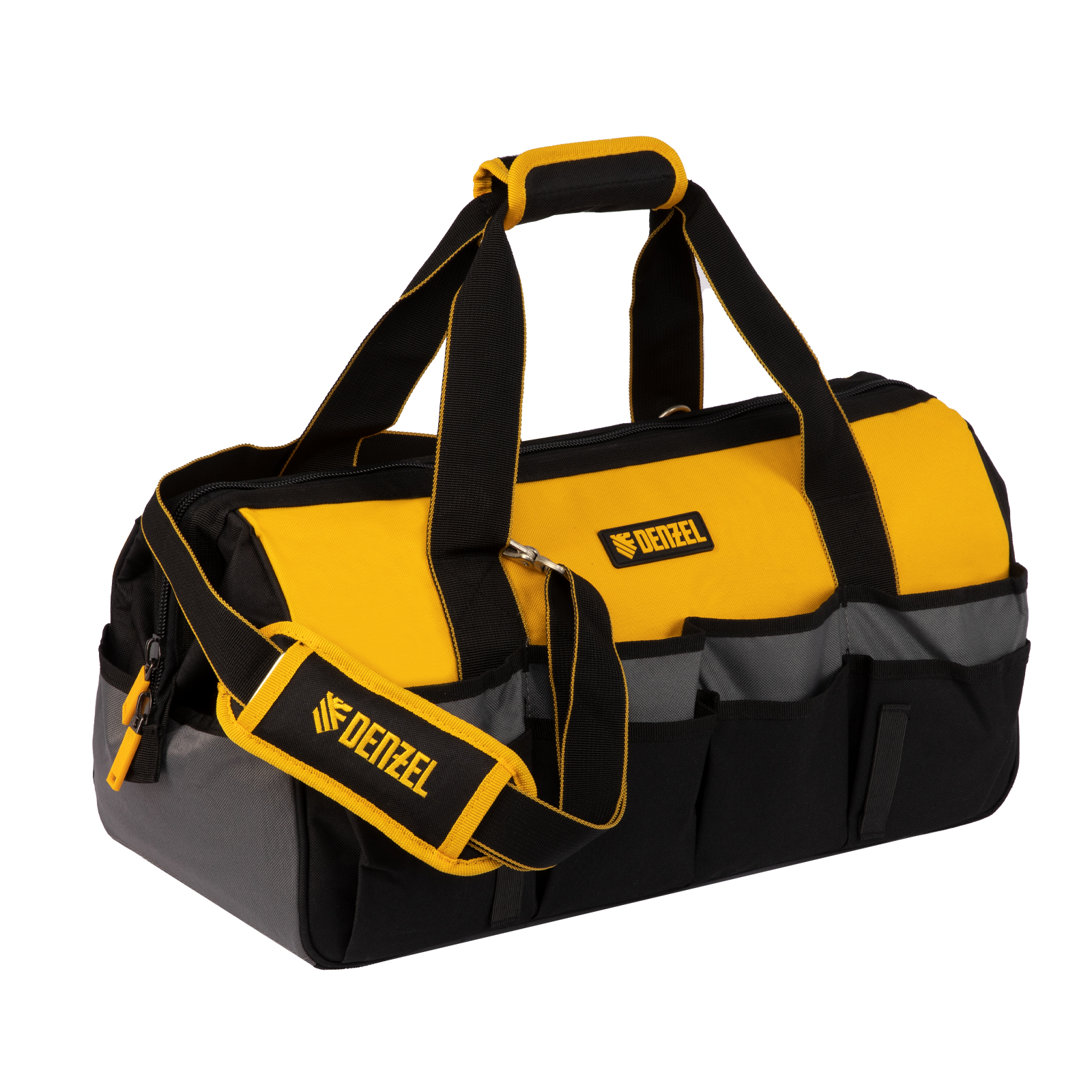 Сумка Denzel 90293 габаритами 500 х 245 х 300 мм с 20 карманами (в том числе съемным органайзером на 10 карманов) и наплечным ремнем, вмещает большое количество инструментов и используется для их хранения и транспортировки. Пригодится монтажнику, сантехнику, мастеру на выезде и автовладельцу.