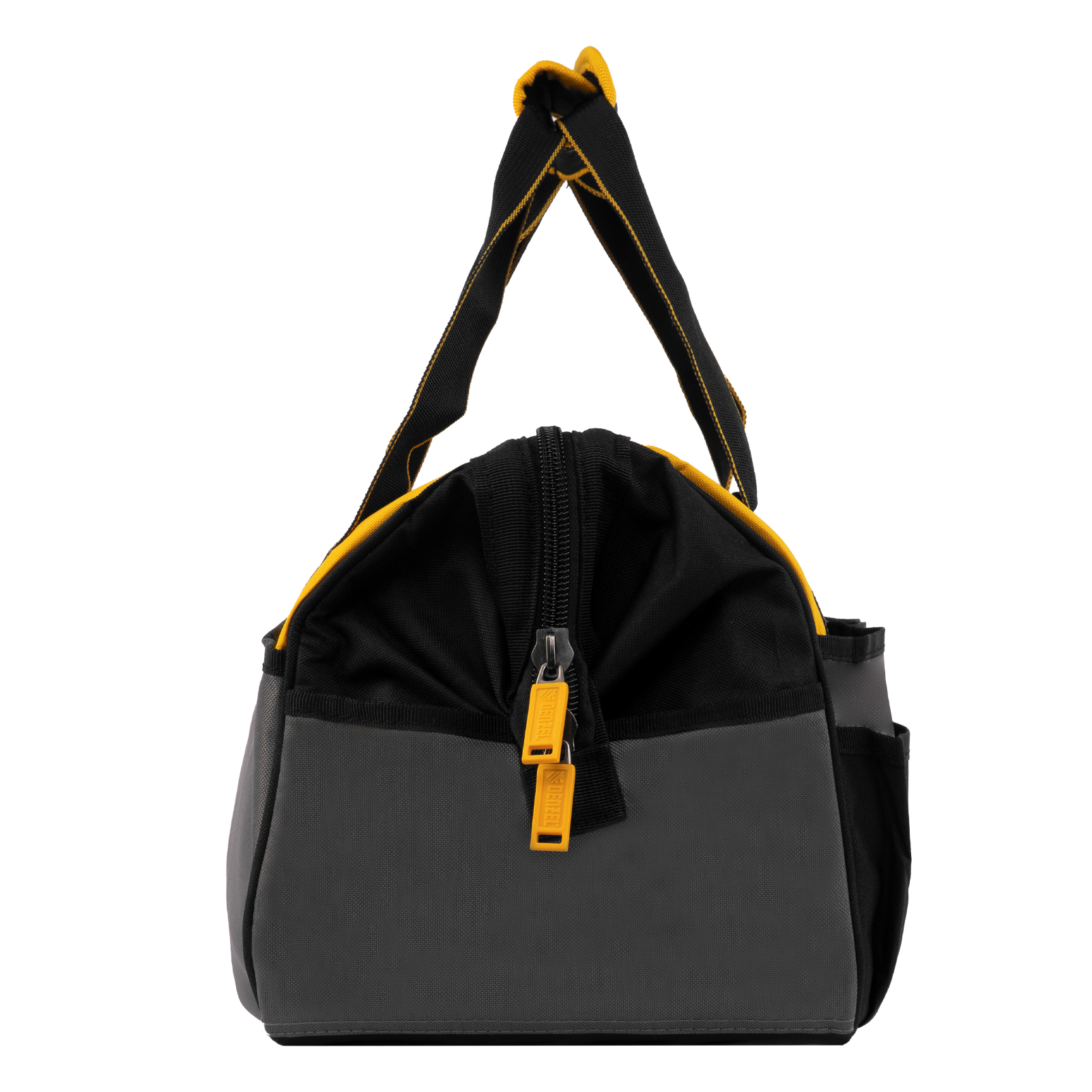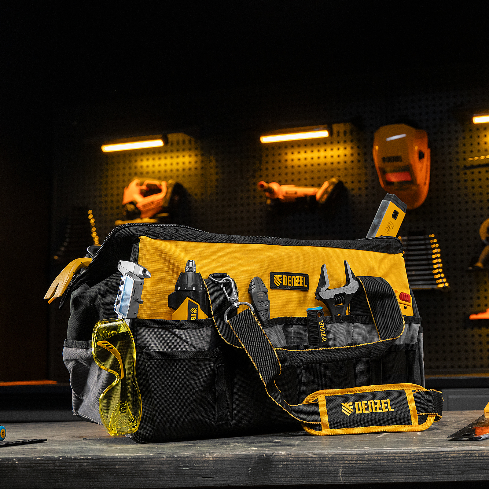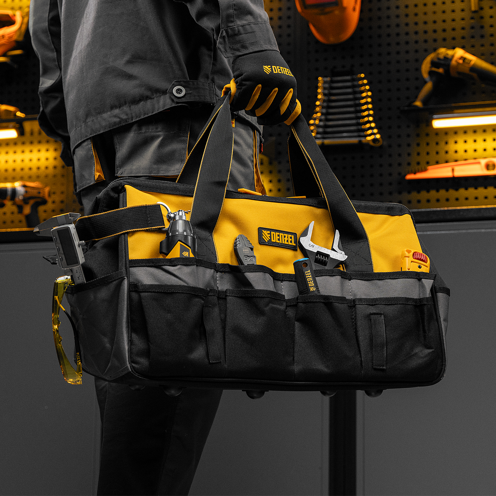 Сумка Denzel 90293 габаритами 500 х 245 х 300 мм с 20 карманами (в том числе съемным органайзером на 10 карманов) и наплечным ремнем, вмещает большое количество инструментов и используется для их хранения и транспортировки. Пригодится монтажнику, сантехнику, мастеру на выезде и автовладельцу.