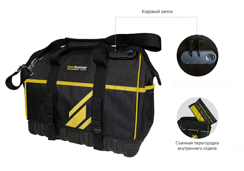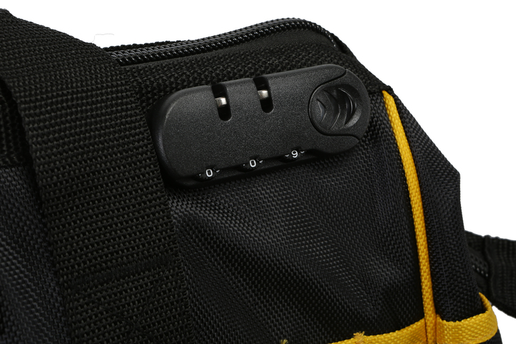 Оснащена кодовым замком для безопасного хранения инструмента внутри. 100% полиэстер выдерживает нагрузку в 30 кг, устойчив к растяжению и стиранию. Дополнительные вставки в стенки сумки позволяют ей лучше держать эргономичную форму при переноске инструментов. Быстрая широкая молния позволяет мгновенно открыть сумку и получить доступ к инструменту. Съёмная перегородка во внутреннем отделе сумки помогает зонировать пространство для инструмента, а также сама снабжена карманами. Возможность её снятия позволяет полностью контролировать эргономику хранения инструмента.