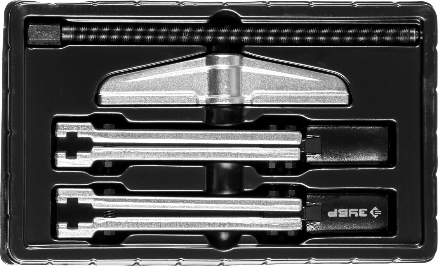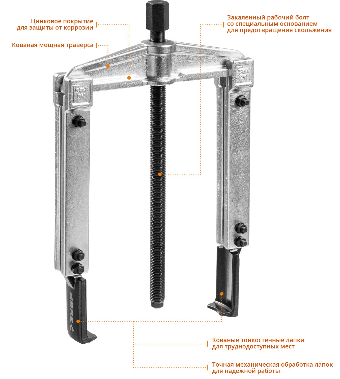Захваты съемника выкованы из качественной инструментальной стали, что обеспечивает долгий срок службы при работе с высокими нагрузками. Позволяет работать с широким рядом узлов. Уменьшенные по толщине захваты дают возможность работать в условиях ограниченного пространства.