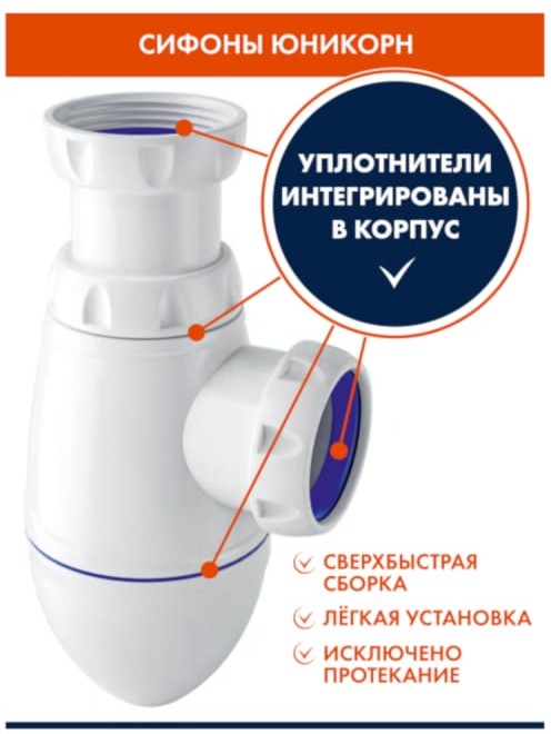 Уплотнительные прокладки сифона интегрированы в корпус, а сам сифон поставляется в максимально собранном виде, что обеспечивает сверхбыструю и простую установку сифона.