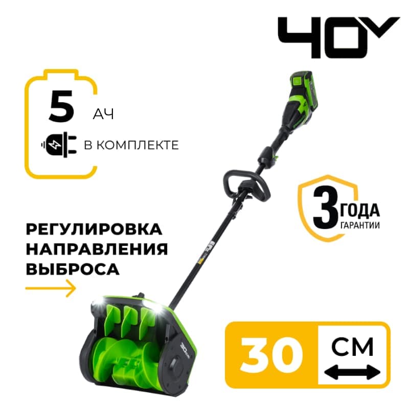 Снегоуборщик аккумуляторный Greenworks GD40SS2, 40V, 30 см, с регулируемым направлением выброса, бесщеточный, с 1хАКБ 5 Ач и ЗУ (2603107UG). Станет отличным зимним дополнением к вашей коллекции устройств для сада 40V. Незаменимый помощник владельцев дач, частных домов, отдельно стоящих гаражей. Удобно чистить не только открытые площадки, но и террасы, патио. Шнек снегоуборщика выполнен из прочного пластика. Он не повреждает декоративное покрытие очищая снег до основания.