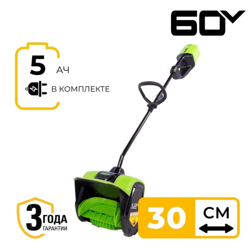 60V аккумуляторный снегоуборщик Greenworks, арт. 2602607; аккумулятор Greenworks 60V, 5 Ач; зарядное устройство Greenworks 60V, 2A; Руководство по эксплуатации; Гарантийный талон.