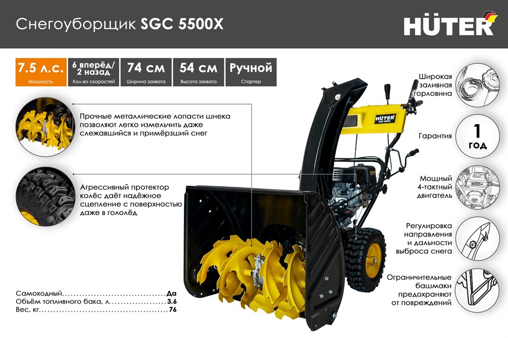 Снегоуборщик Huter SGC 5500Х отличается ковшом увеличенного размера. Ширина 74 см и высота 54 см позволяет убирать большое количество снега. Мощный бензиновый двигатель 7.5 л.с. обеспечивает высокую производительность. Это прочная машина, хорошо работающая на асфальтовом покрытии. Плотно утрамбованный снег легко разбивается металлическим шнеком с острыми краями. Машина легко прорезает скопления снега, чтобы расчистить тротуары, дорожки и проезды, не требуя от оператора слишком много физической энергии.