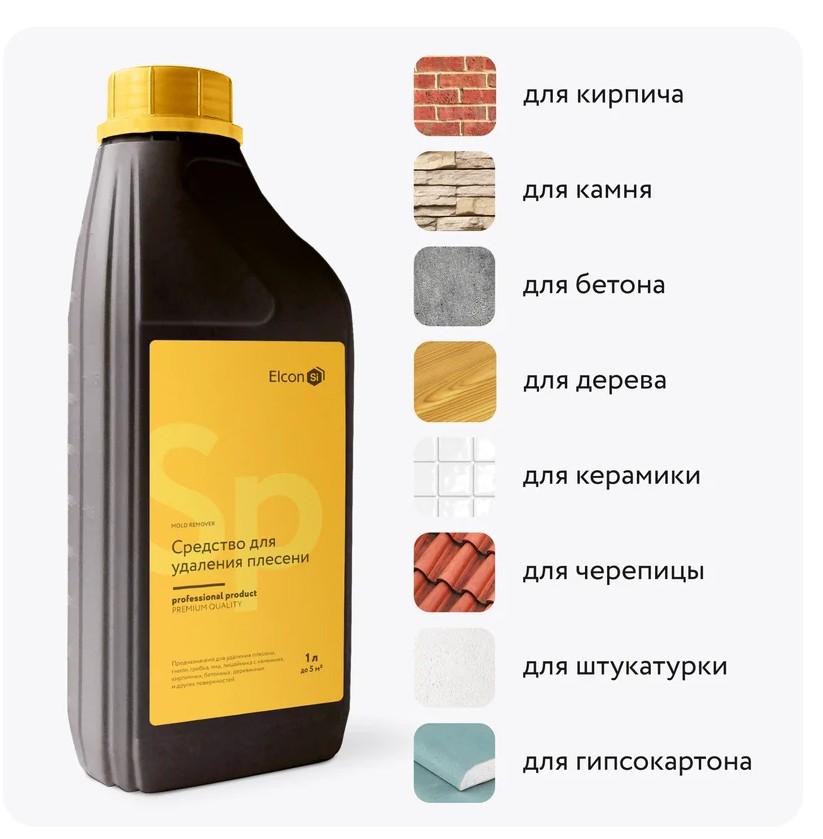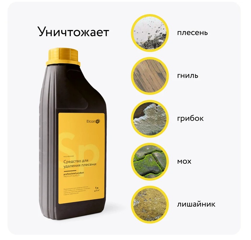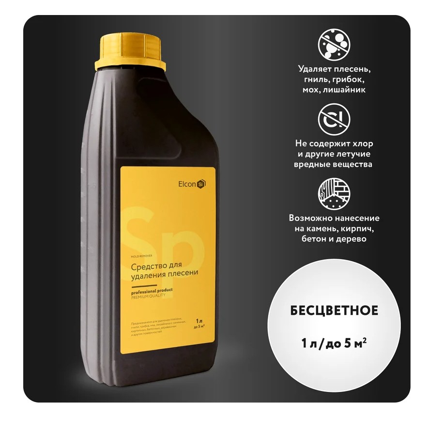 Уничтожитель плесени Elcon SP без хлора 1 л 00-00750083 предназначен для удаления плесени, гнили, грибка, мха, лишайника с каменных, кирпичных, бетонных, деревянных и других поверхностей.