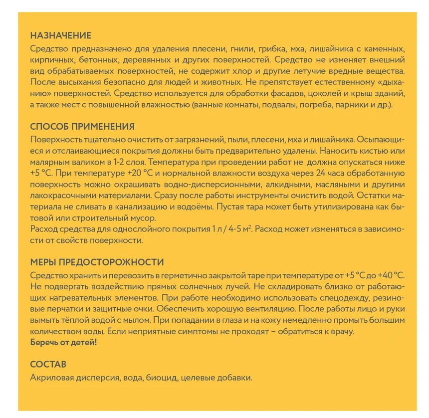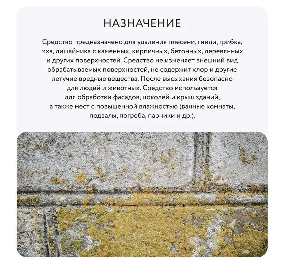 - Удаляет плесень, гниль, грибок, мох, лишайник
