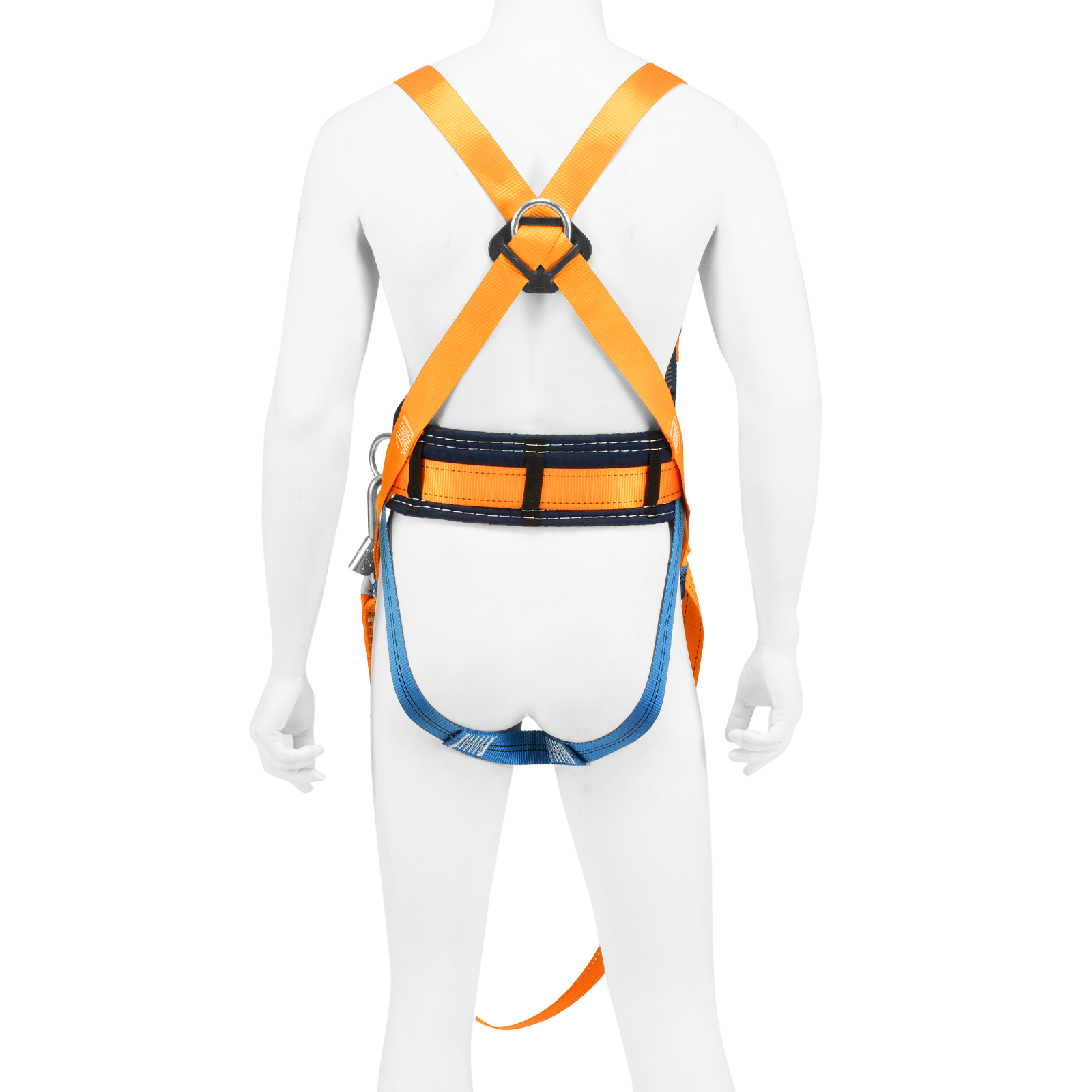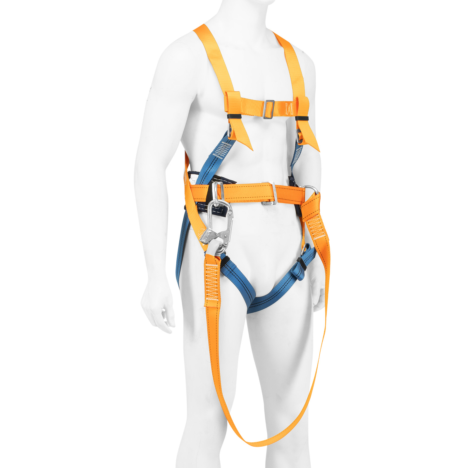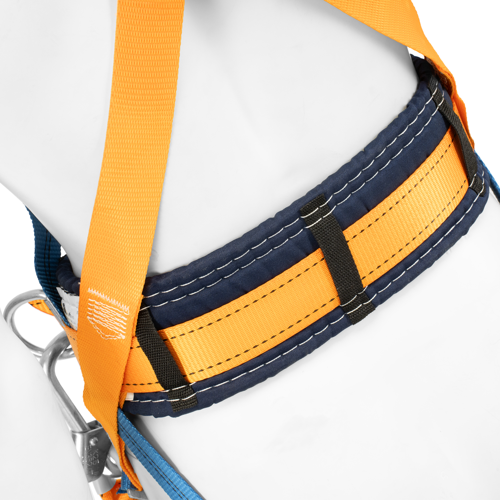 - Надежное крепление — привязь имеет 2 прочных D-кольца на поясном ремне и одно на спине, а также большой монтажный карабин.
