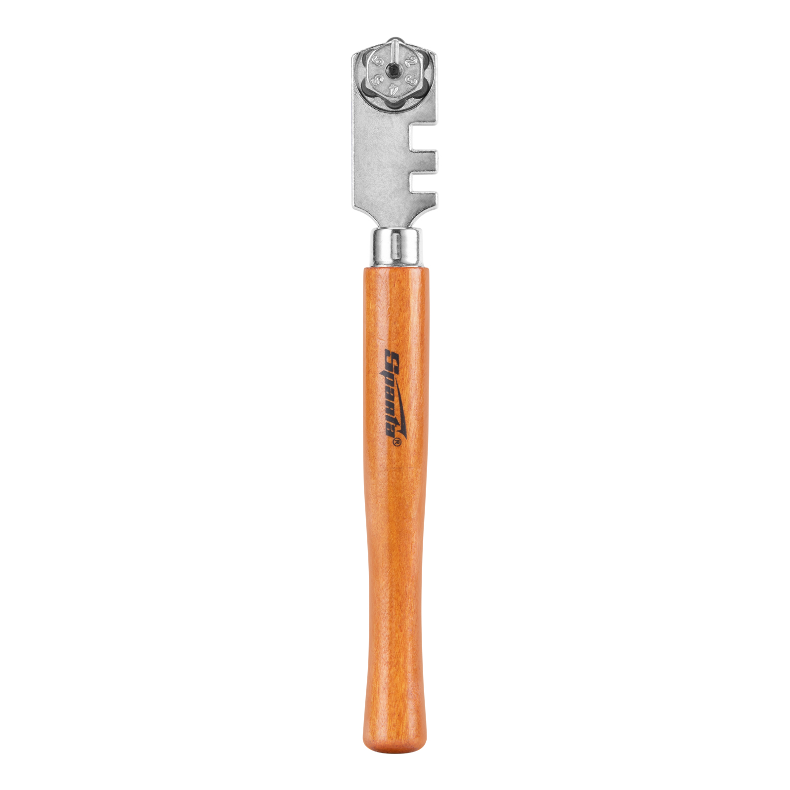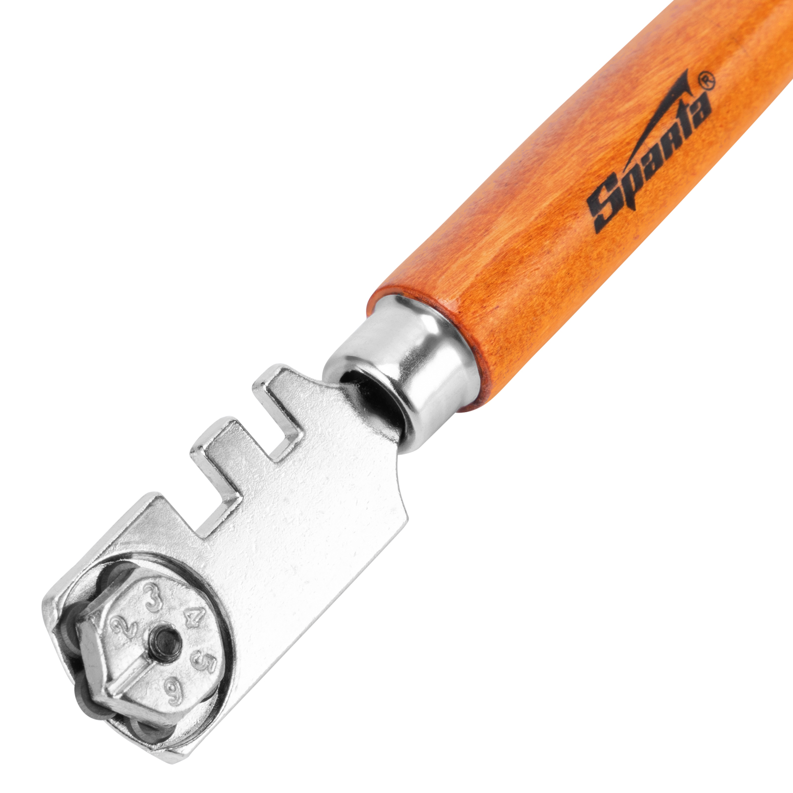 Шестироликовый стеклорез Sparta 872235 с деревянной рукояткой служит для резки стекла толщиной до 6 мм и подходит для бытового использования. С его помощью можно изготовить столешницу, полочку, заменить стекло в аквариуме или двери. Блок с 6 роликами позволяет быстро установить новый режущий элемент взамен изношенного — достаточно ослабить винт и повернуть головку. На головке имеются пазы шириной 4 и 5 мм для отламывания кромки стекла, увеличивающие функциональность стеклореза.