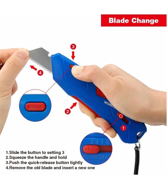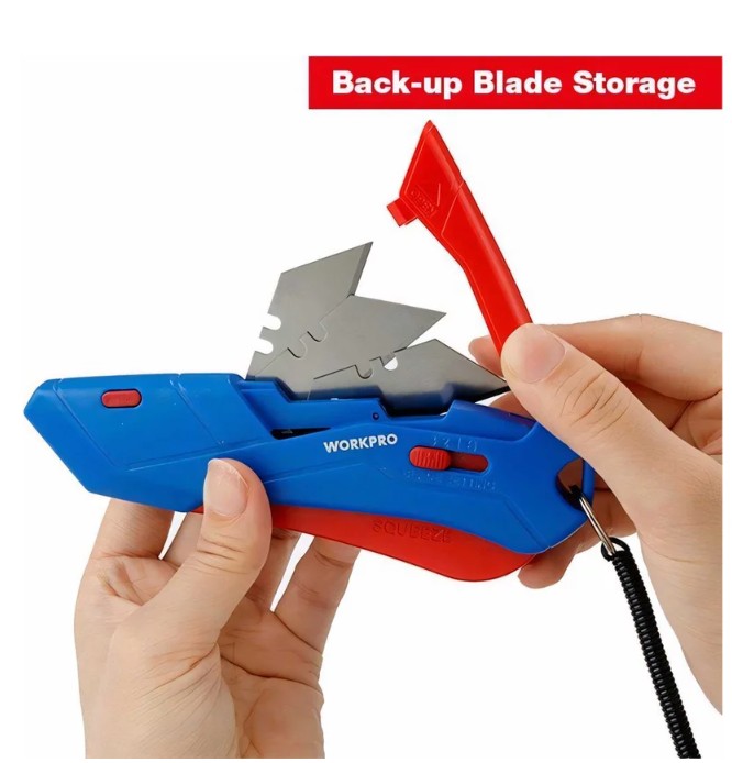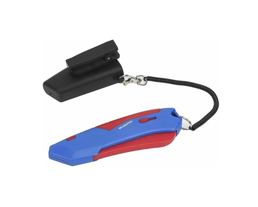 Прочный пластиковый зажим позволяет носить изделие на рабочей одежде. Лезвия выполнены из качественной стали, стойкой к коррозии, а также легко заменяются при необходимости с помощью нажатия двух кнопок на корпусе.