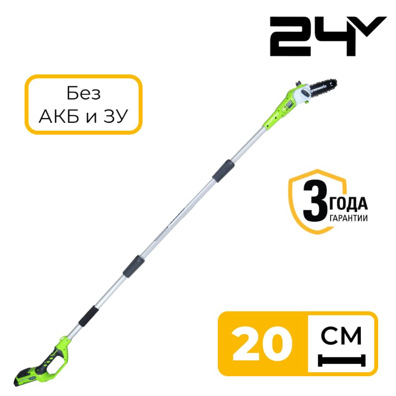 Высоторез сучкорез аккумуляторный Greenworks G24PS20 серии 24 вольта - специально разработан для подрезки веток и сучьев у деревьев на достаточной высоте, чтобы не пользоваться лестницами. Составная конструкция устройства позволяет менять длину от 155 до 205 см. - это позволит с легкостью осуществить подрезку на высоте до 4-х метров от земли. Этот садовый высоторез оснащается цепной пилой с пильной шиной из кремнистой стали и цепью Oregon. Довольно легкий вес - 3.2 кг. является серьезным преимуществом в сравнение с бензиновыми аналогами, им проще и легче работать. А главное - электрический двигатель имеет низкий уровень шума и вибрации, экологичен и прост в эксплуатации. Он не требует замены свечей или фильтров, масла, подготовки топливной смеси. Для удобства использования устройства предусмотрен ряд конструктивных особенностей: Удобная прорезиненная рукоять с опорой на предплечье - для правильного распределения веса; Наплечный ремень для удобства переноса устройства во время работы; Без ключевое натяжение и замена цепи и шины; Автоматическая смазка цепи и масляный бачок с прозрачным индикатором уровня масла. Важным преимуществом этого садового сучкореза является длительное время автономной работы - до 100 срезов от 4 А/ч батареи и наличие системы безопасности, предохраняющей от случайного включения. Предусмотрена система защиты двигателя от перегрузок. Устройство совместимо с батареями из серии Гринворкс G-24V, которые используются еще с более чем 20 устройствами. Это позволит вам в будущем сэкономить на покупке батарей, при покупке инструмента серии 24 вольта. Расширенная гарантия - 3 года. Преимущества модели: Лёгкий вес - 3,2 кг.; 3-х секционная штанга; Максимальная длина высотореза/сучкореза - 205 см.; Шина 20 см. и цепь производства Oregon; Время автономной работы до 100 срезов от 4 А/ч батареи; Предохранитель от случайного включения; Защита двигателя от перегрузок; Включение одной кнопкой; Работа от 24V аккумулятора, совместимого с другими устройствами из линейки 24 вольт (20+ устройств); Гарантия 3 года. Состав комплекта: Серия G-24V (модель G24PS20) аккумуляторный высоторез 20 см., арт. 2000107; Руководство по эксплуатации; Гарантийный талон. Внимание: этот комплект поставляется без аккумулятора (АКБ) и зарядного устройства (ЗУ). |