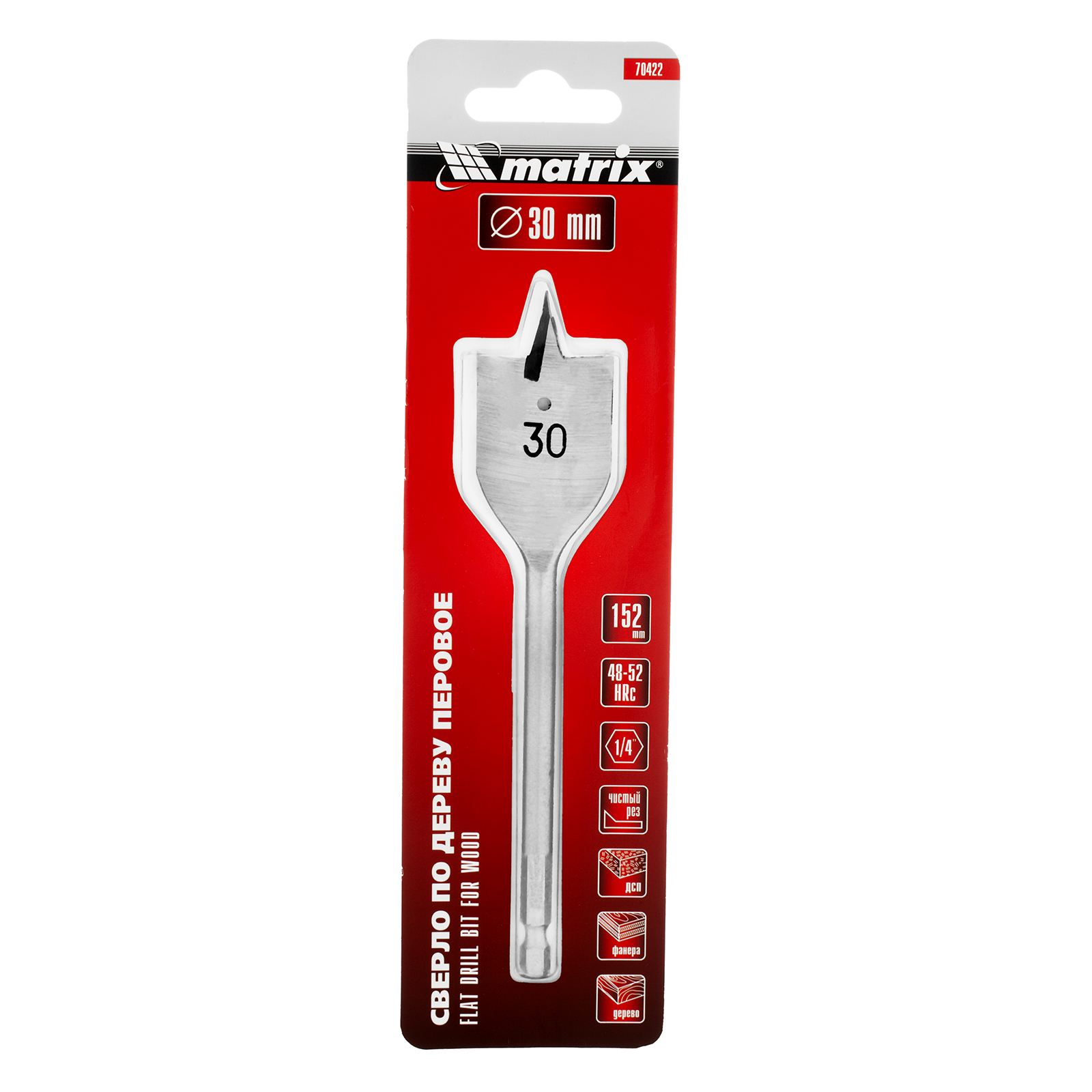 Перовое сверло по дереву Matrix 70422 диаметром 30 мм, с 6-гранным хвостовиком, имеет рабочую часть в виде «лопатки» с режущими кромками по бокам, поэтому эффективно для сверления глубоких сквозных и глухих отверстий. Оснастка устанавливается на ручную механическую или электрическую дрель, сверлильный станок, с ее помощью можно сверлить древесину любых пород.
