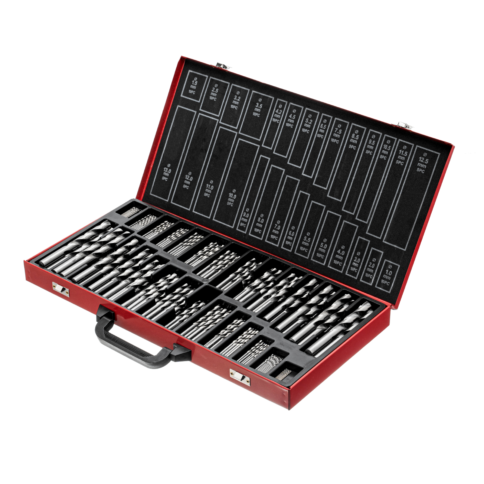Набор Matrix 723230 включает в себя 230 сверл по металлу из стали HSS, диаметром 1-13 мм, упакованных в металлический кейс. Угол заточки сверл составляет 118°, поэтому они оптимальны для обработки черных металлов, стали, чугуна и твердой бронзы. Набор пригодится в быту и на строительной площадке.