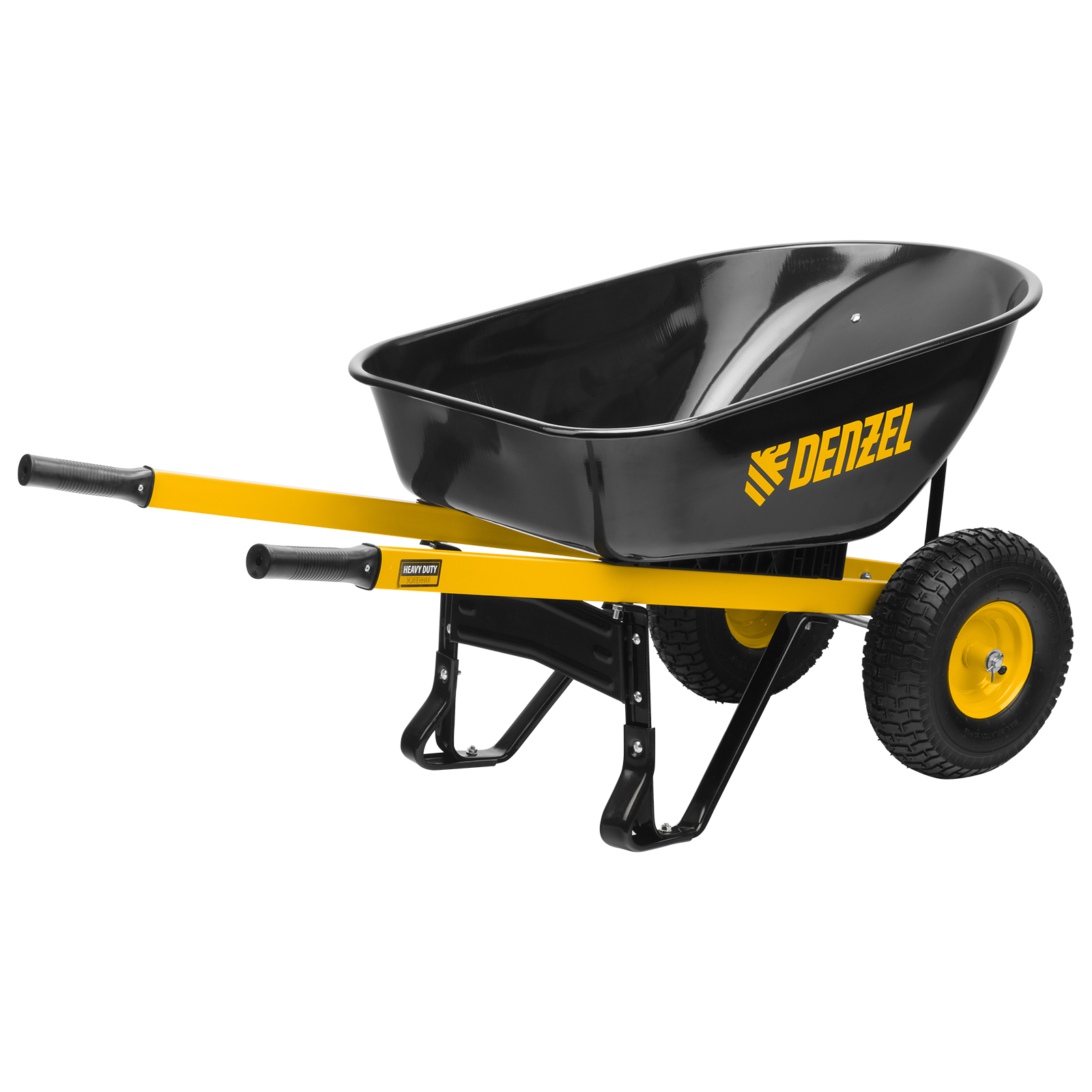 - Широкие пневмоколеса с грунтозацепом и мощная рама с подпятниками предотвращают проваливание тачки в грунт.
