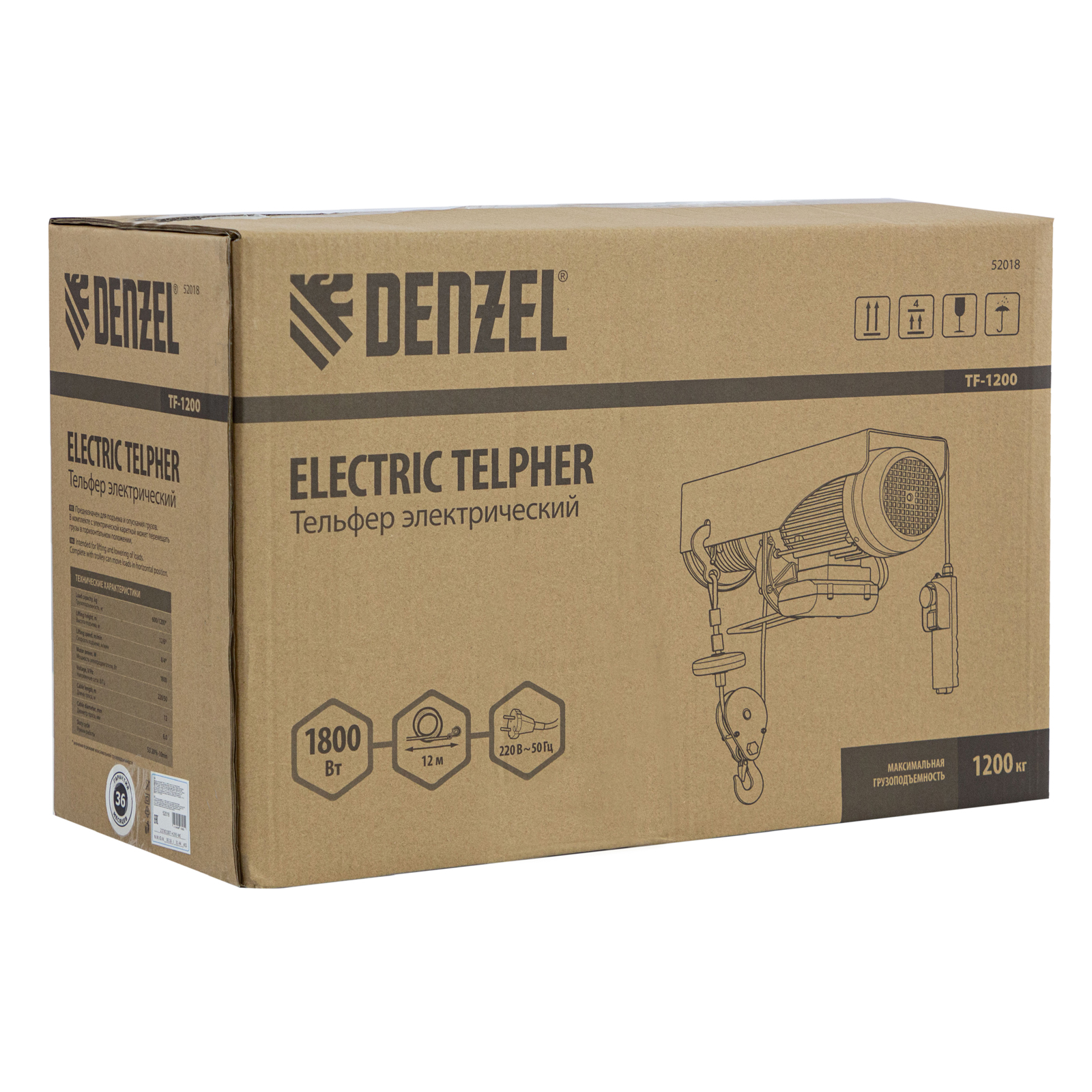Электрический тельфер Denzel TF-1200 52018 мощностью 1800 Вт способен поднимать автомобильные двигатели, строительные материалы и другие грузы массой до 0,6 т напрямую и до 1,2 т с помощью блока полиспаста. Высота подъема составляет 6 м при использовании полиспаста и 12 м без него, скорость — 4 и 8 м/мин соответственно. Устройство пригодится в гараже, автомастерской или на строительной площадке. Полиспаст входит в комплект поставки.