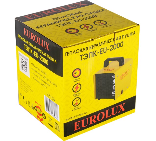 Модель Eurolux ТЭПК-EU-2000 оснащена системой термозащиты. Тепловая пушка прямоугольной формы компактна при использовании и хранении. Малый вес 1,61 кг и наличие ручки в верхней части корпуса позволяют легко переносить устройство. Для подключения теплопушки к однофазной сети предусмотрена евровилка. Отсутствие токсичных выхлопных газов позволяет использовать ее в закрытых помещениях. Прочный металлический корпус устойчив к механическим повреждениям.