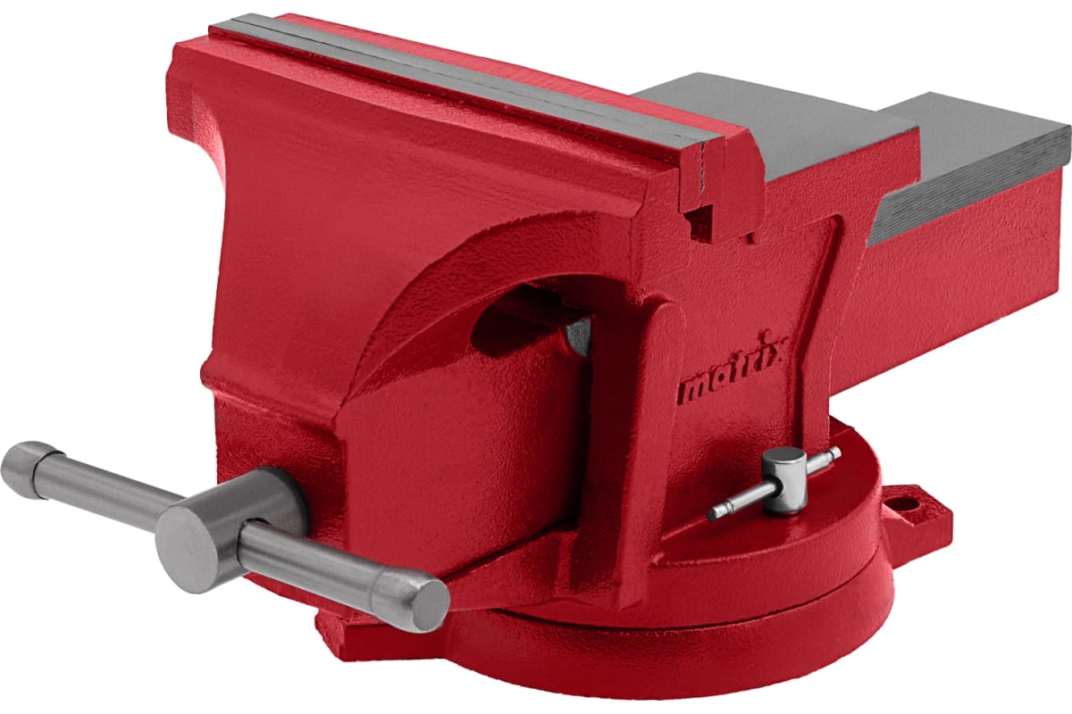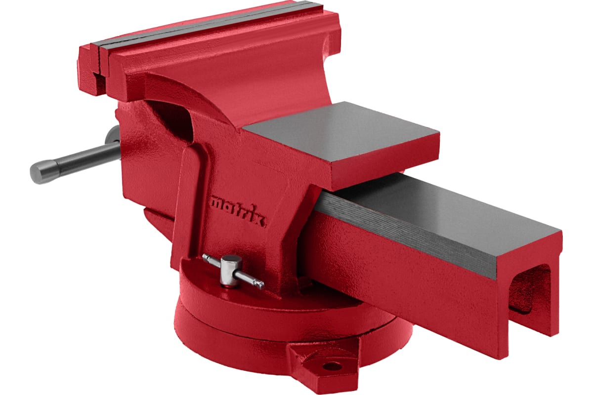 Поворотные слесарные тиски Matrix с наковальней и губками шириной 200 мм имеют рабочий ход 175 мм и предназначены для захвата и фиксации различных деталей. Поворотный механизм с прижимными винтами позволяет вращать тиски на 360° и фиксировать их в выбранном положении для удобной обработки заготовок с разных сторон. Инструмент используется для шлифовки, сверления и проведения других работ. Будет полезен в мастерской и гараже.