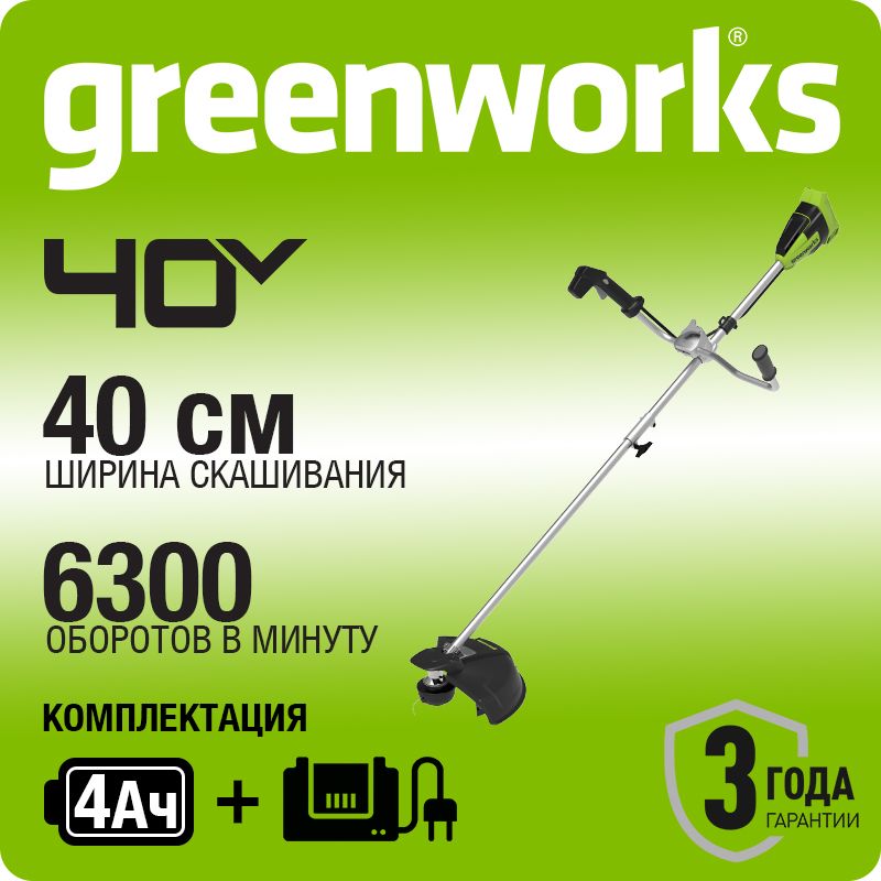 Триммер аккумуляторный Greenworks GD40BCB, 40V, 40 см, бесщеточный, с 1хАКБ 4Ач и ЗУ (2105707UB).