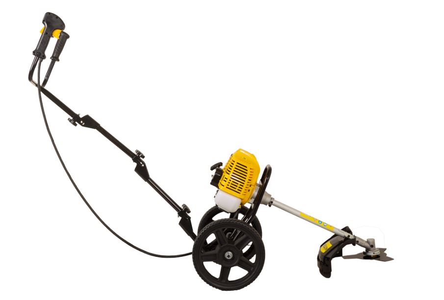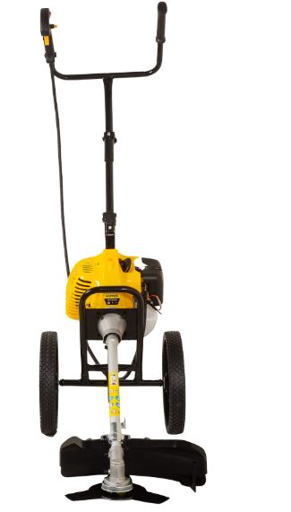 Триммер оснащён разъемной штангой и удобной складной рукояткой велосипедного типа, что улучшает управление устройством. Два больших колеса обеспечивают хорошую проходимость и устойчивость на неровностях грунта. Для безопасности оператора предусмотрен защитный кожух, который предотвращает разлет обрезков травы и веток.