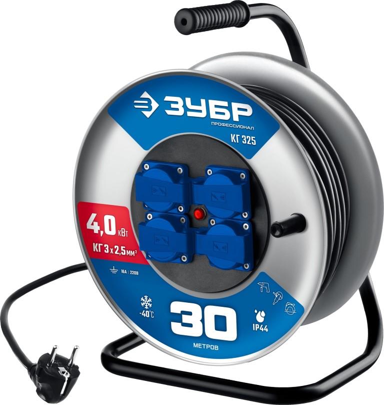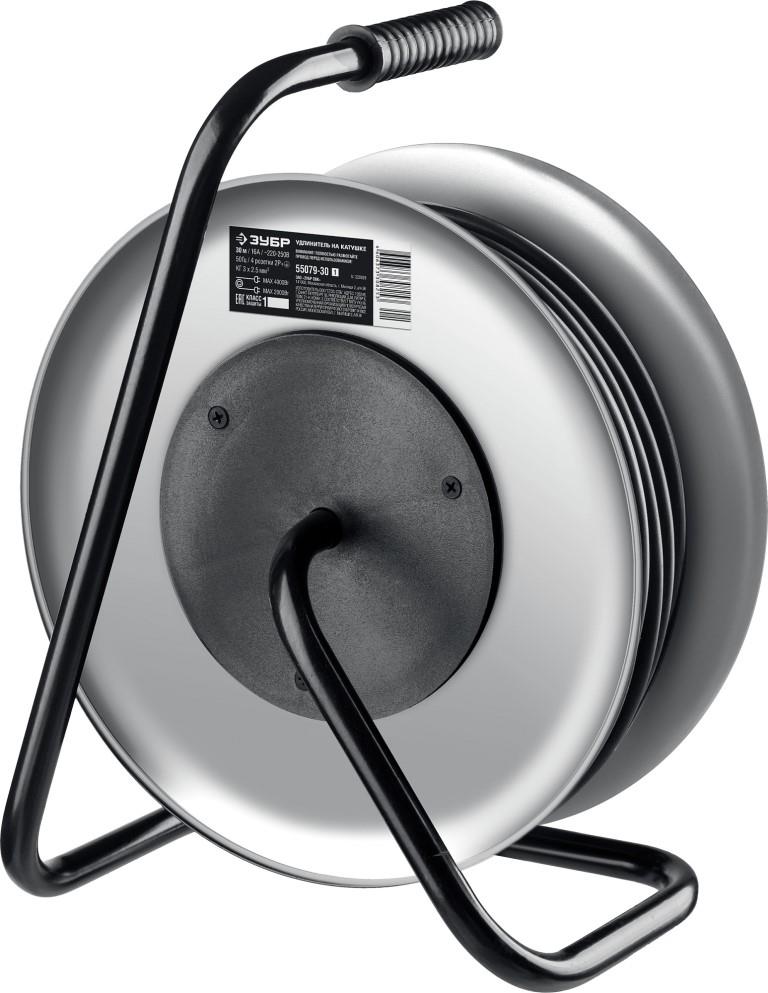 Силовой удлинитель на катушке ЗУБР 55079-30_z01, применяется для подключения электрических приборов к сети, предназначен для использования, как в помещении, так и на улице.