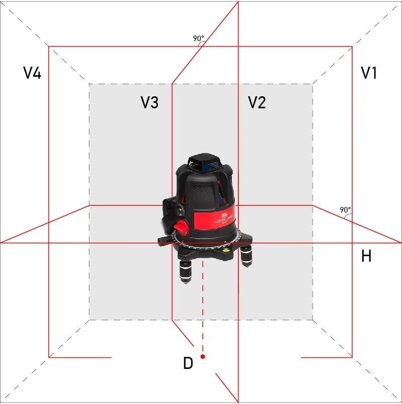 - Для вертикальной разметки можно поочередно включать вертикальные лазерные линии. Их количество зависит от модели: две (2V) или четыре (4V). Все лазерные линии (вертикальные и горизонтальная) пересекаются между собой под углом 90°. В месте пересечения проецируется «лазерный крест» удобный для одновременной разметки по вертикали и горизонтали или переноса ортогональных точек (вперед-назад, вправо-влево).