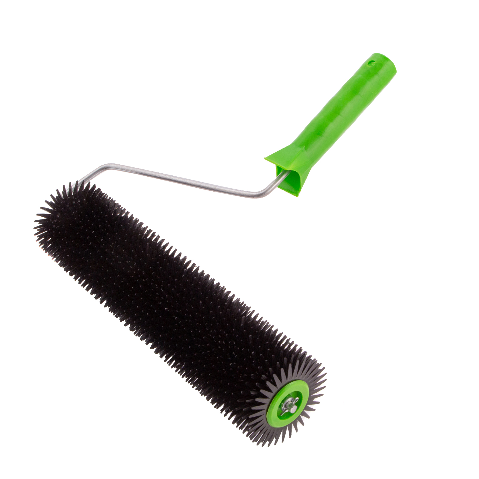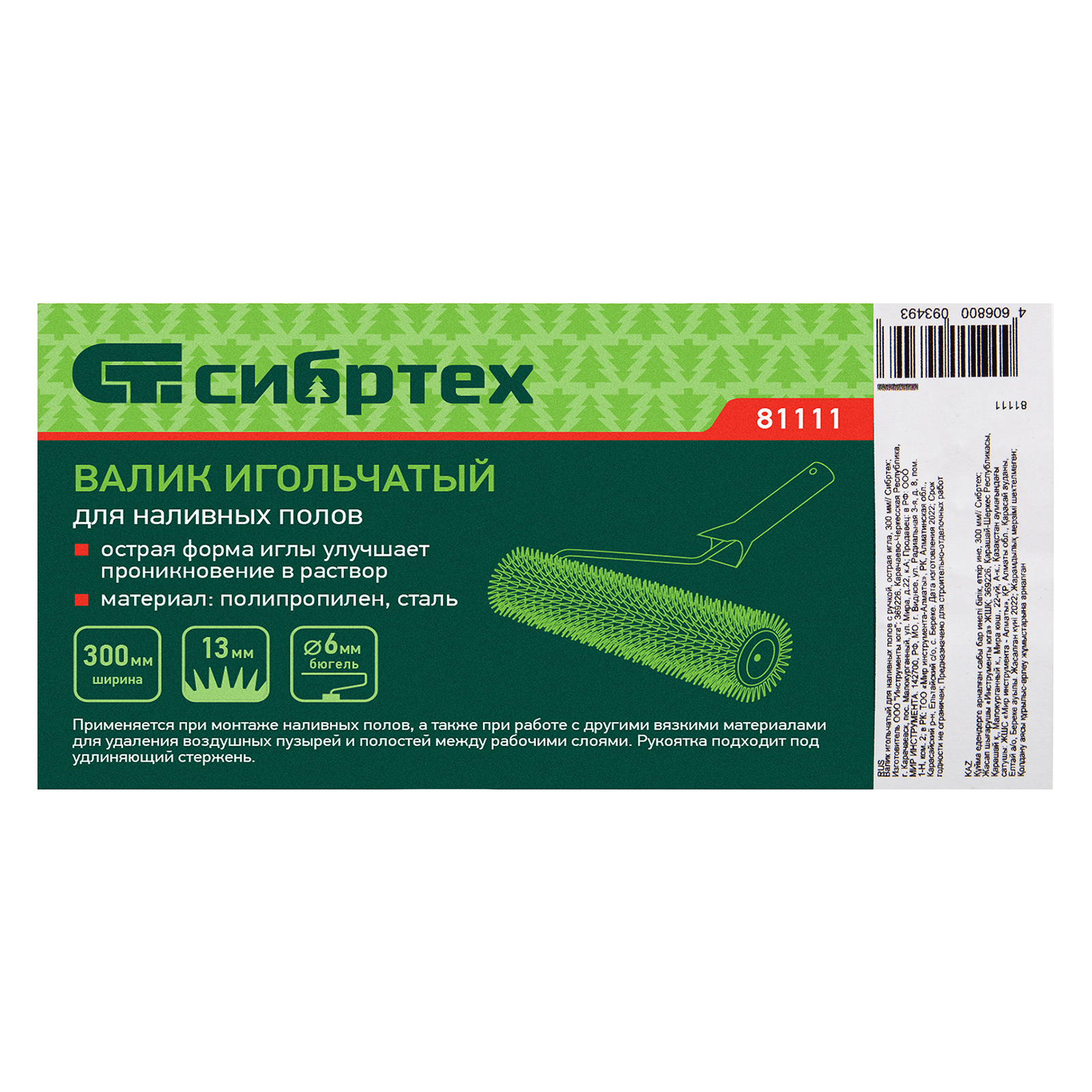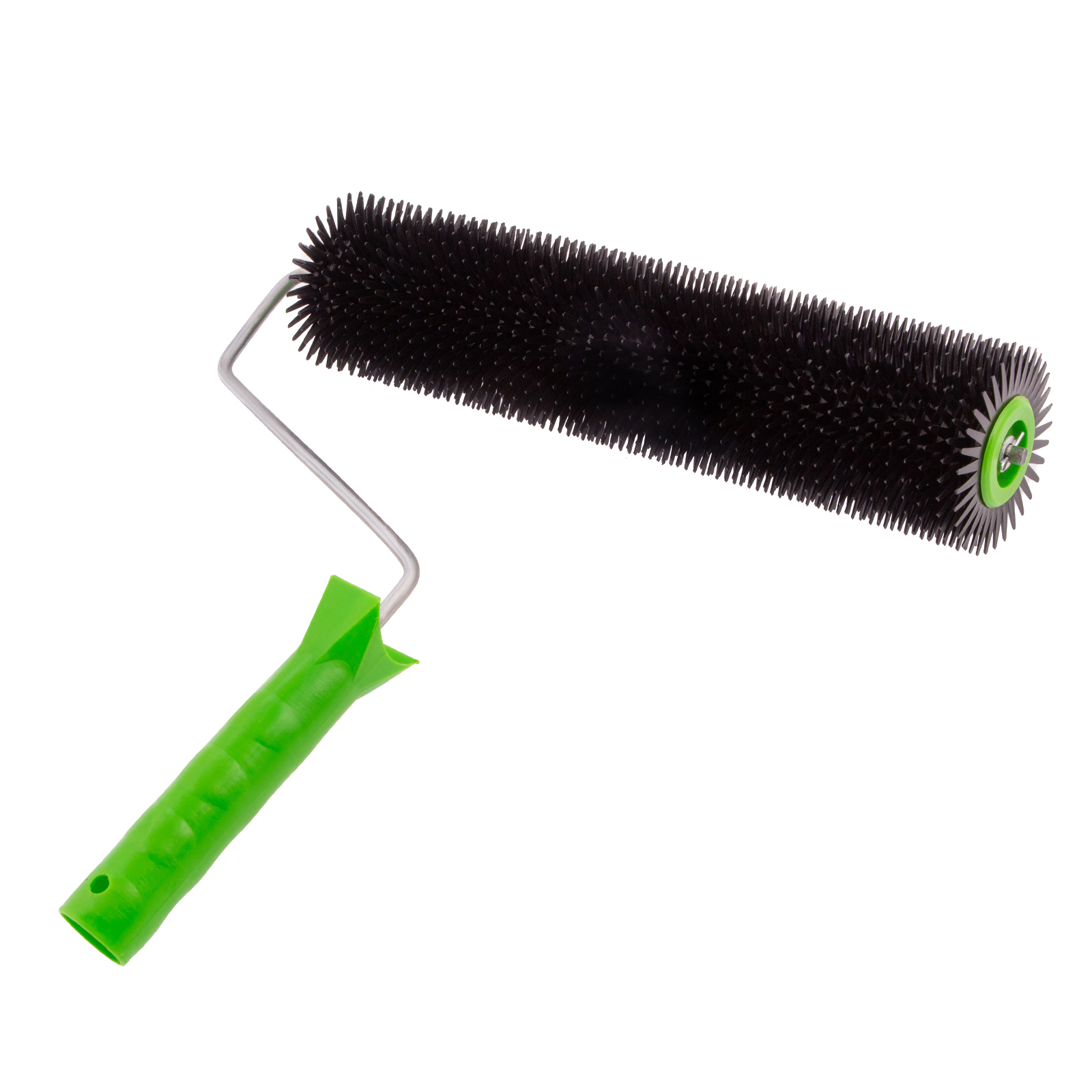 Валик игольчатый Сибртех 81110 с ручкой, длина 240 мм, применяется при монтаже наливных полов, а также при работе с другими вязкими материалами для удаления воздушных пузырей и полостей между рабочими слоями. Иголки длиной 14 мм подходят для покрытий небольшой толщины.