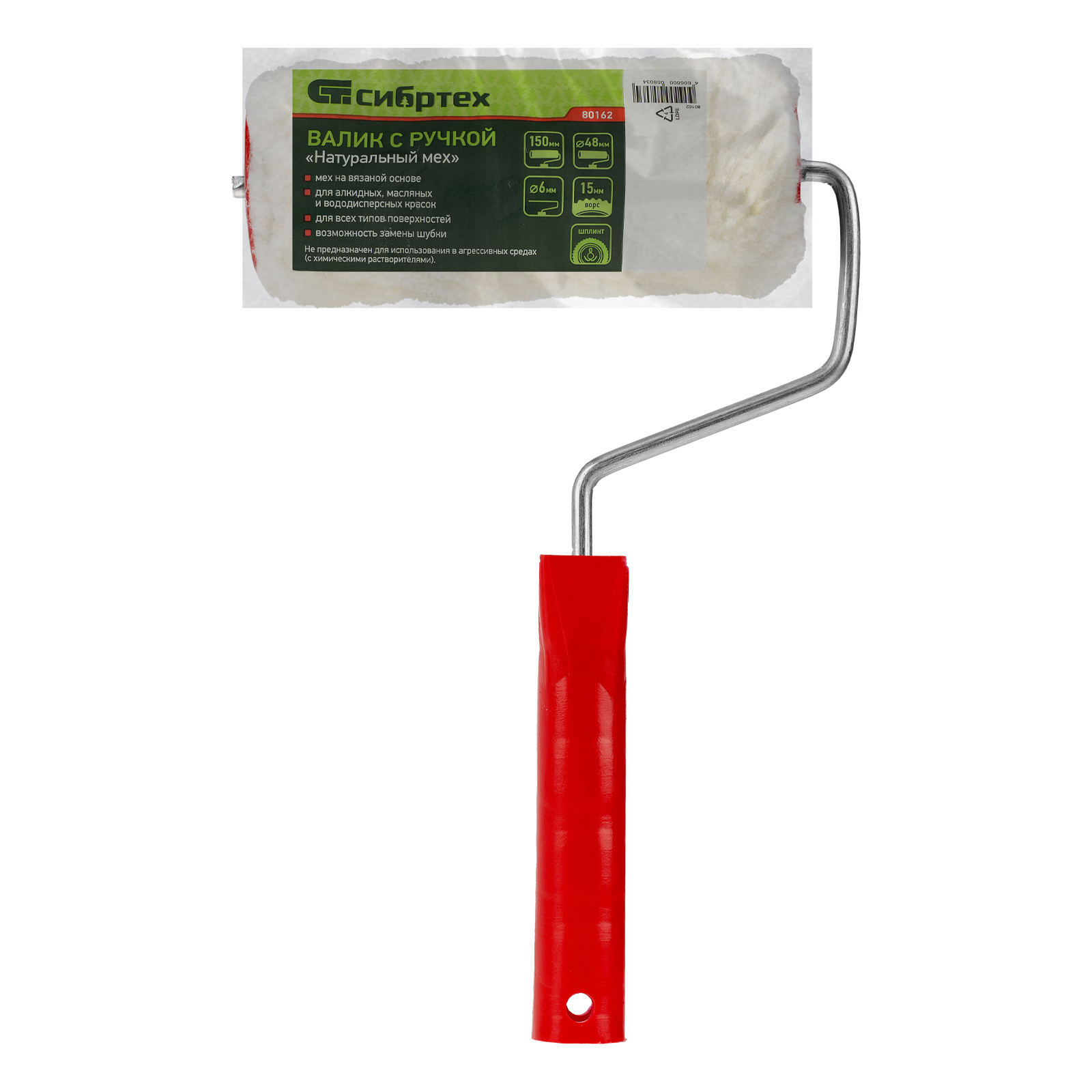 Валик Сибртех «Натуральный мех» 80162 в сборе с ручкой 6 мм, роликом 150 х 48 мм (крепление шплинтом), применяется при окрашивании фасадов зданий, стен, потолков и т.д. С его помощью можно работать с алкидными, масляными и водно-дисперсионными составами.