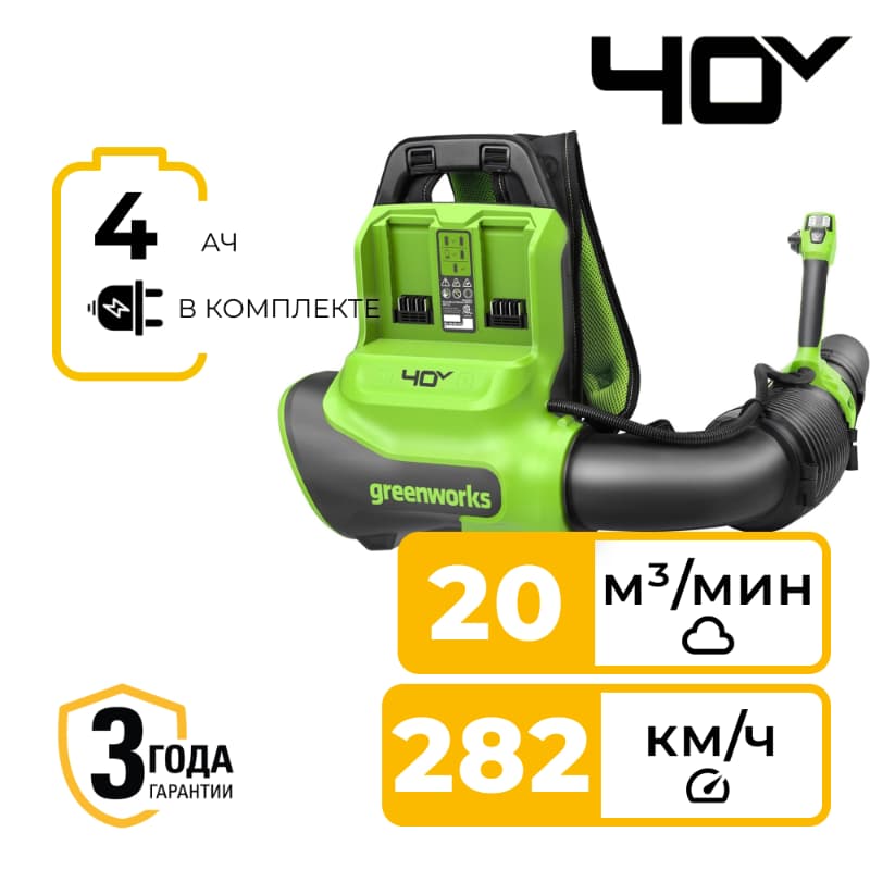 Ранцевая воздуходувка аккумуляторная Greenworks GD40BPG2, 40V, бесщеточная, с 1хАКБ 4 Ач и ЗУ (2408107UB).