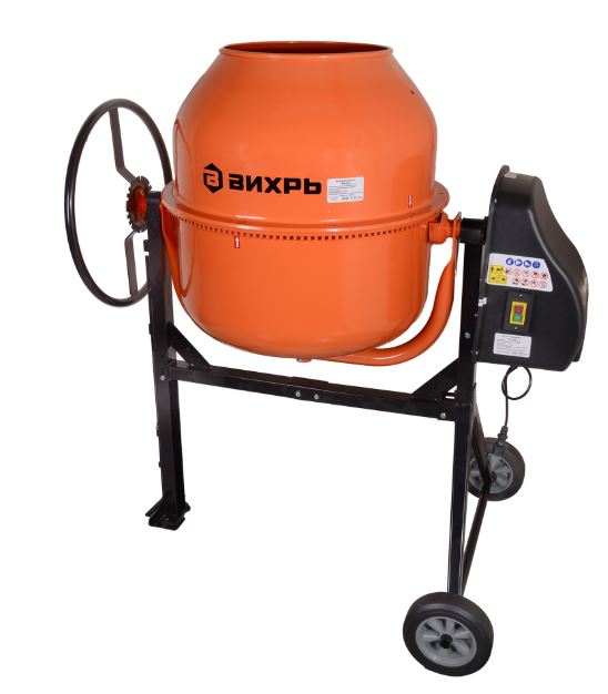 Бетономешалка Вихрь БМ-230 гравитационного типа: барабан вращается вокруг своей оси, а неподвижные лопасти внутри обеспечивают равномерное перемешивание компонентов. Общий объем барабана составляет 230 л. Полезный объем загрузки составляет 165 л, что позволяет за один цикл приготовить большое количество раствора. Это особенно удобно при масштабных строительных работах.