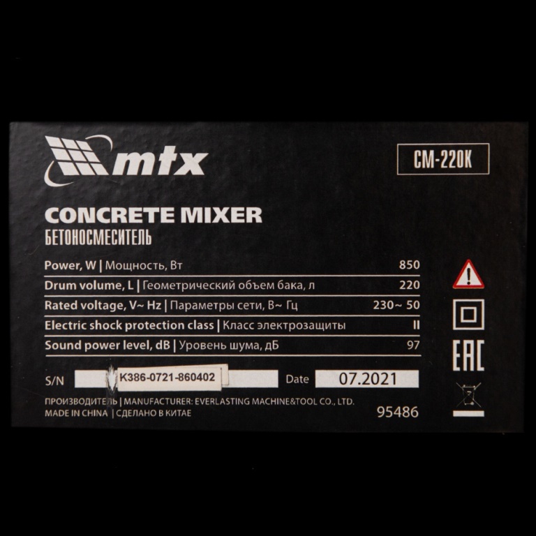 Бетоносмеситель MTX CM-220K 95486 мощностью 850 Вт, с баком на 220 л, предназначен для приготовления бетонных смесей и штукатурных растворов. Оптимальное соотношение мощности двигателя и объема бака обеспечивает высокую скорость перемешивания и надлежащее качество полученной смеси. Максимальный объем готового раствора составляет 147 л. Бетоносмеситель будет полезен на строительной площадке.