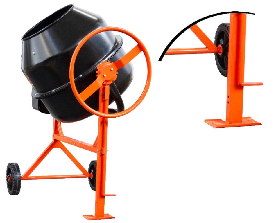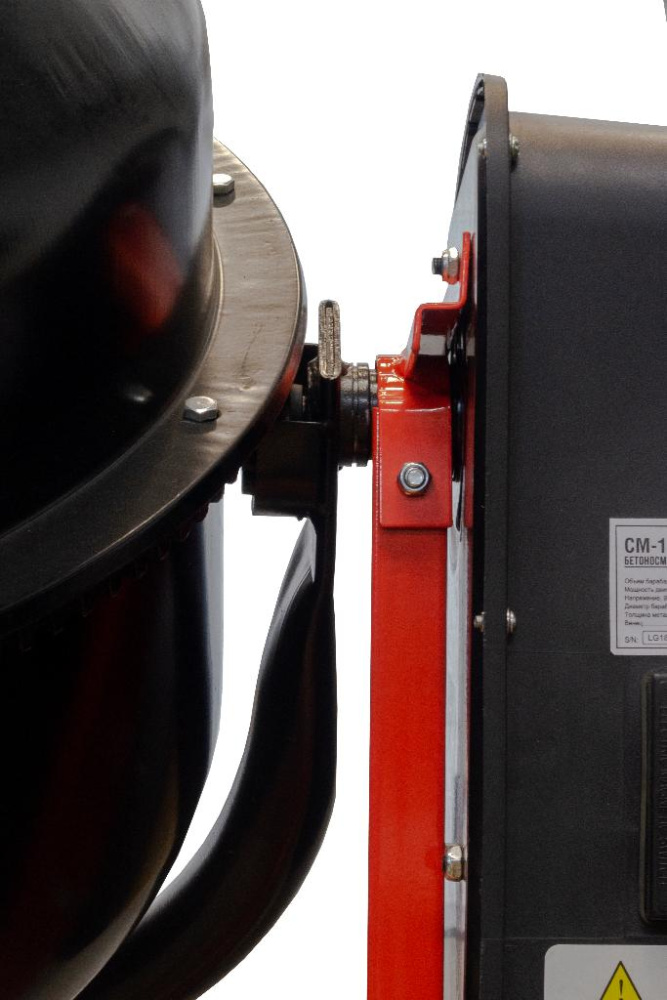 Траверса с закрепленным на ней барабаном фиксируется к опорной раме (через втулки и опорные подшипники. С одной стороны рамы расположен механизм опрокидывания емкости с фиксатором для создания необходимого рабочего угла и возможности выгрузки готового раствора. С другой стороны, прикреплен блок электродвигателя и рабочая шестерня.