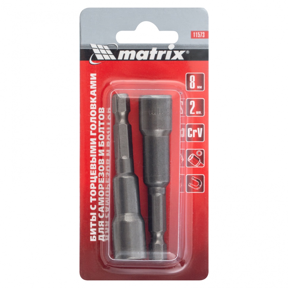 Биты с торцевыми головками Matrix 11573 размером 8 х 65 мм, 2 шт. в уп., предназначены для работ с шуруповертом. Используются при монтаже и демонтаже болтов и шурупов, а также кровельных саморезов с внешним шестигранником. Увеличенная длина 65 мм облегчает работу в труднодоступных местах. Биты способны полностью заменить торцевые головки, особенно если под рукой нет трещотки.